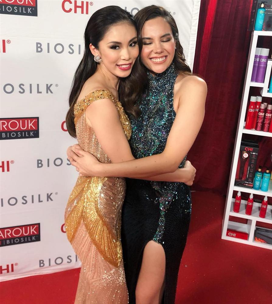 Với phong cách trang điểm mờ nhạt, chiếc đầm không mấy nổi bật, Catriona Gray dường như lép vế hoàn toàn khi đứng chung 1 khung hình với “hội chị em”.