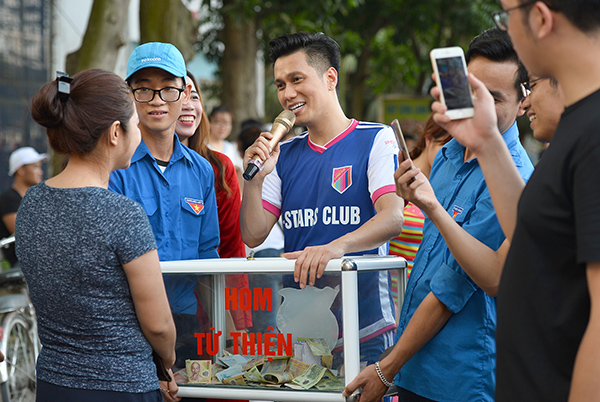 Sau đó, diễn viên Việt Anh rất năng nổ cầm hòm tự thiện đi giao lưu với khán giả và kêu gọi mọi người ủng hộ cho các bạn sinh viên nghèo hiếu học.