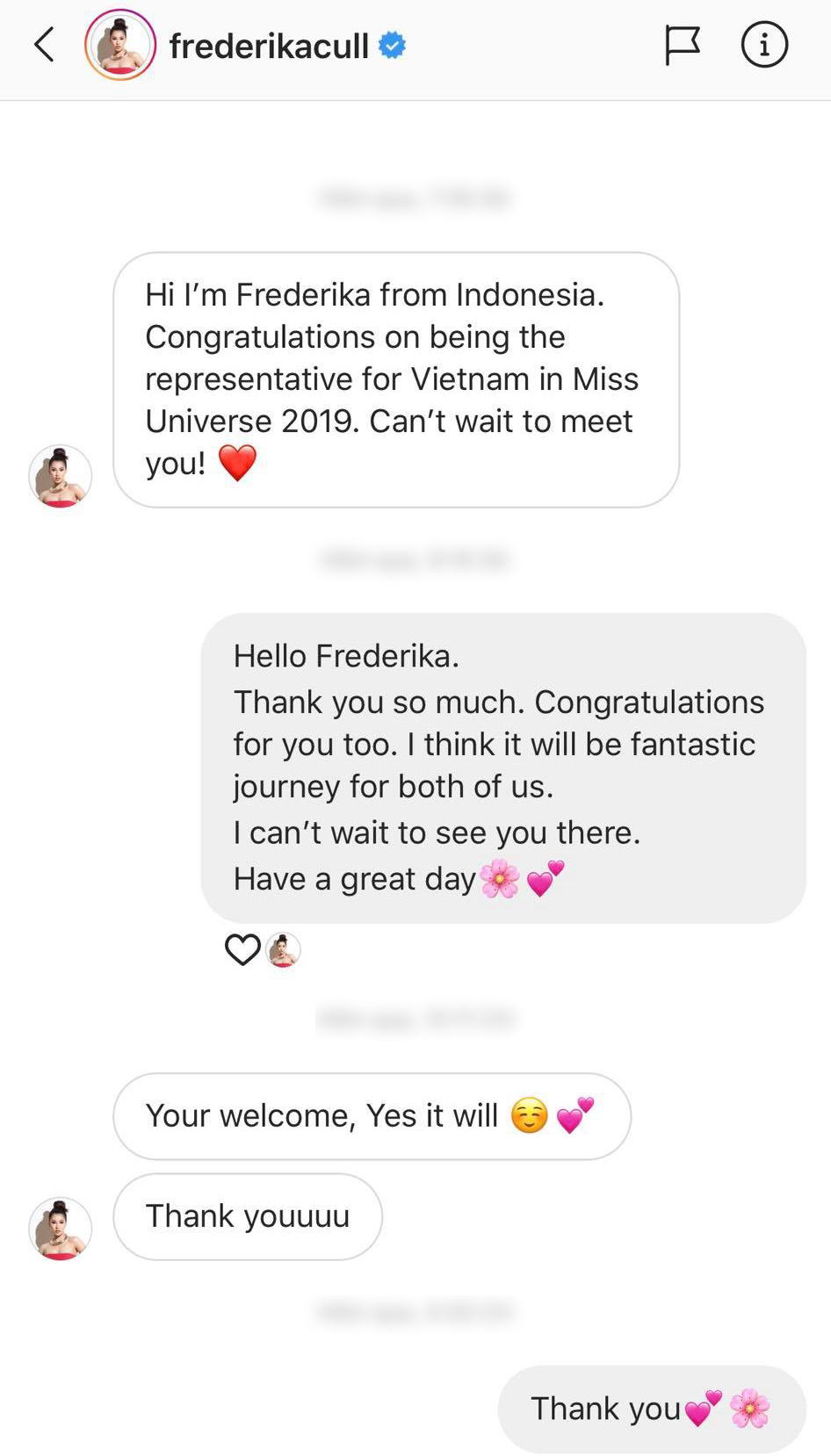 Mới đây trên trang cá nhân, đại diện Việt Nam tại Miss Universe 2019 - Hoàng Thùy vừa đăng tải đoạn chat được người đẹp đối thủ đến từ Indonesia đích thân chủ động làm quen.