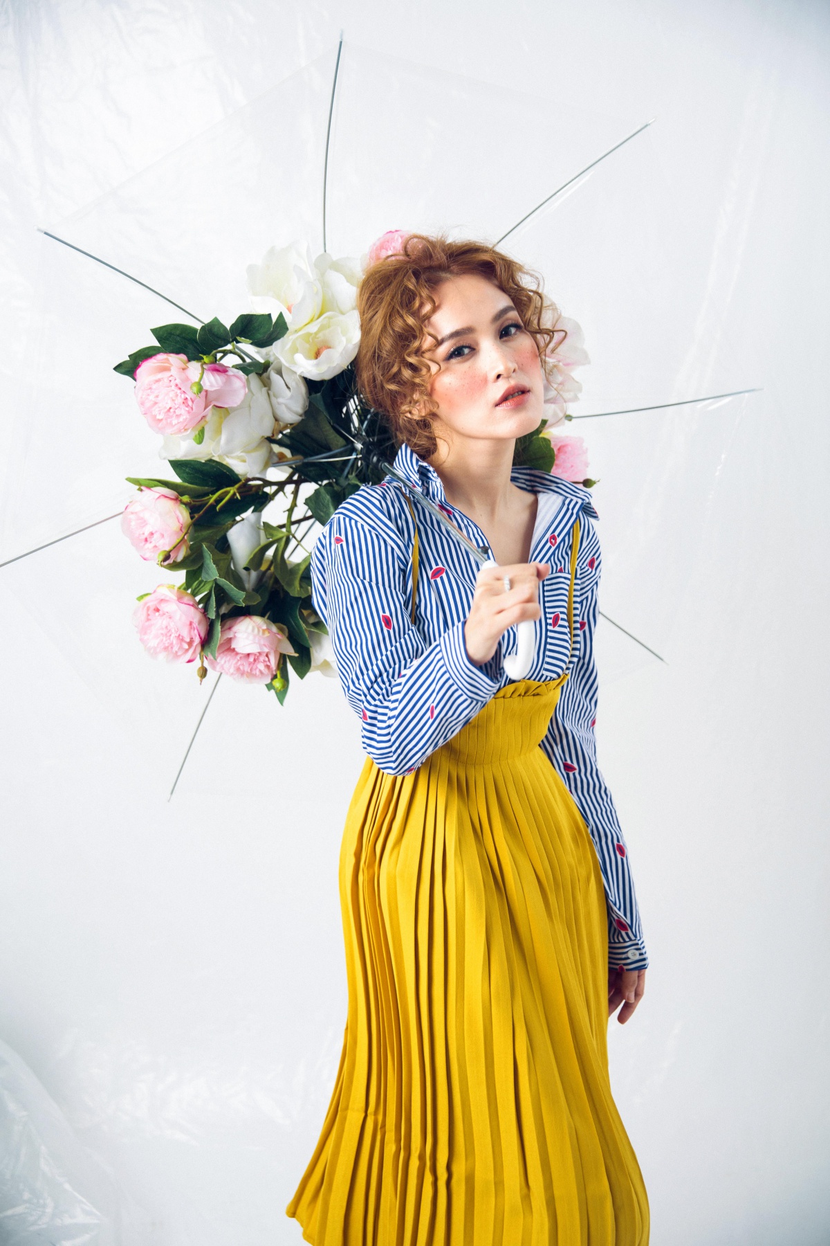 Trang phục Tú Vi diện trong bộ ảnh vẫn giữ sự nữ tính như trước đây. Cô gợi ý cách phối sơ mi hoặc áo dài tay cổ lọ với các chân váy màu sắc để mang đến sự trẻ trung.