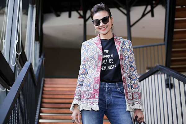 Và tối 11/7, Thanh Hằng xuất hiện tại sự kiện văn hóa du lịch hiện đại với sự kết hợp giữa thời trang và công nghệ do Ủy Ban nhân dân TP HCM phát động. Siêu mẫu - diễn viên diện set đồ trẻ trung với quần jeans xắn gấu, áo thun phối cùng áo vest tua rua họa tiết thổ cẩm vô cùng lạ mắt.