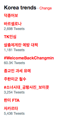 Hashtag “WelcomeBackChangmin” xếp thứ 5 trong bảng tìm kiếm ở Hàn Quốc.