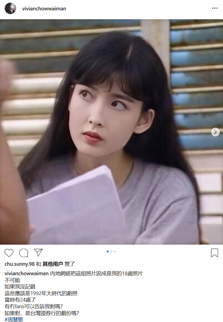Châu Huệ Mẫn đăng tải hình ảnh với nội dung: “Dân mạng Trung nói mấy tấm ảnh này của tôi được chụp lúc 18 tuổi. Không thể nào có chuyện đó. Nếu tôi nhớ không lầm thì mấy tấm ảnh này được lấy ở bộ phim Đại thời đại năm 1992. Và lúc đó tôi đã 24 tuổi rồi. Có người hâm mộ đứng ra nói rằng tôi nói đúng rồi hay không?…”