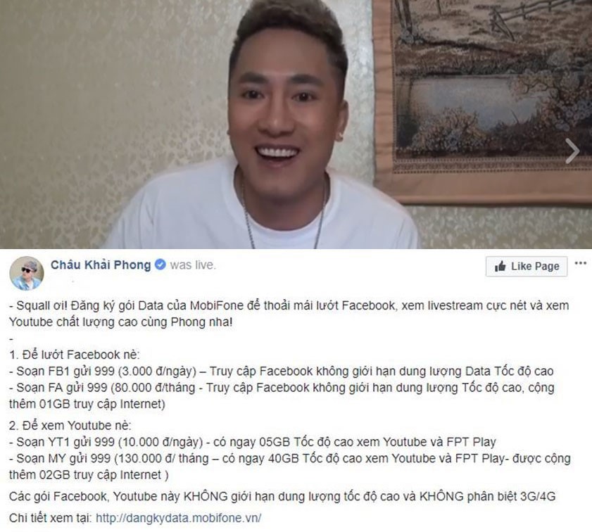 Khi được các fan hưởng ứng và khen ngợi chất lượng “quá đỉnh” của buổi livestream, Châu Khải Phong nhiệt tình chia sẻ cho fan cách đăng ký sử dụng gói Facebook data để các fan có thể online giao lưu với anh thường xuyên với chất lượng tốt và chi phí hợp lý nhất. Theo đó, nếu fan thường xuyên sử dụng Facebook thì có thể đăng ký gói combo FA, chỉ 80.000đ/tháng; fan nào thỉnh thoảng mới dùng Facebook thì có thể chọn lựa gói FB1, chỉ 3.000đ/ngày, mà có thể xài Facebook không giới hạn dung lượng tốc độ cao.