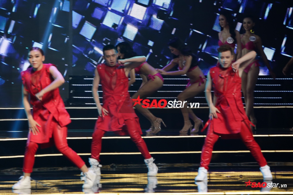 Trong đêm thi, top 15 chung cuộc có phần thi bikini vô cùng nóng bỏng bởi các người đẹp. Đây được xem là phần thi được trông đợi nhất bởi tất cả những đường cong cơ thể được phô diễn. Dù có những sải bước catwalk tự tin nhưng Hoàng Thuỳ không may vấp ngã ở phần thi này.