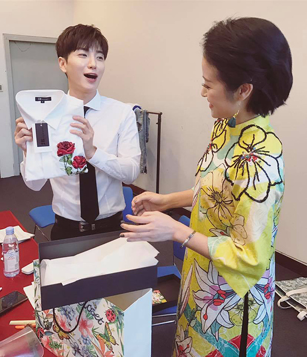 Không chỉ dẫn dắt ăn ý với Leeteuk trên sân khấu mà trong hậu trường, nữ MC Thần tượng Bolero 2017 còn rất thân thiết với trưởng nhóm Super Junior. Cả hai không ngừng trò chuyện vui vẻ, thậm chí, Phí Linh còn gửi tặng áo sơ mi made in Vietnam cho Leeteuk. Dĩ nhiên, nam ca sĩ tỏ ra vô cùng hào hứng, thích thú khi nhận được món quà dễ thương từ cô bạn MC của Việt Nam.