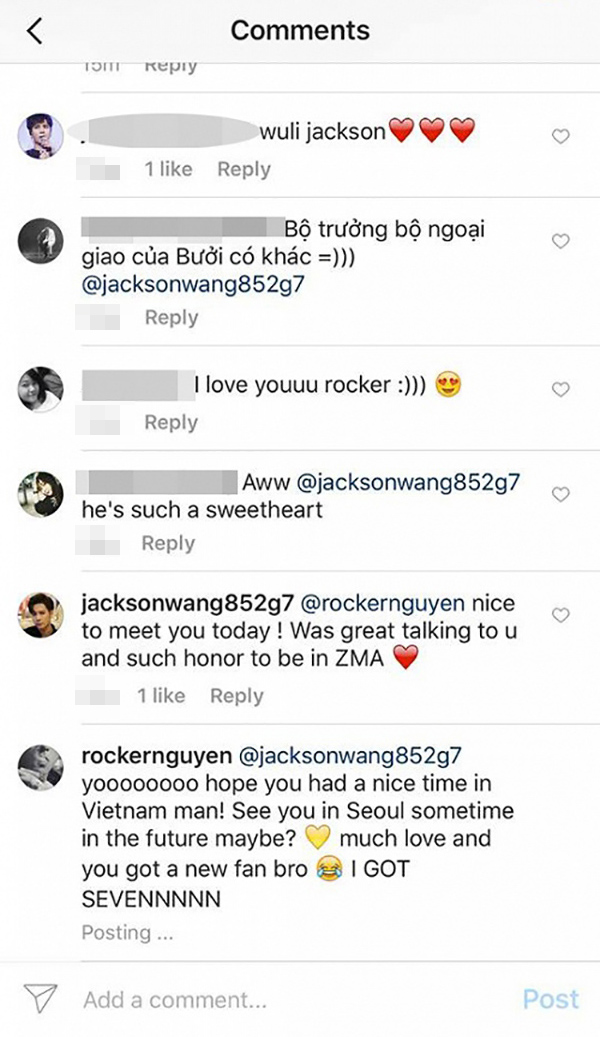 “Quân tử nhất ngôn! Nói là làm! Thực sự lúc đánh vần tên instagram cho bạn mình không nghĩ là bạn nhớ nổi tên họ của mình đâu (họ Nguyễn khó nhớ mà), lại còn bảo là không mang theo điện thoại nên sẽ ghi nhớ về follow nhau sau. Cứ ngỡ là diễn xong về mệt nhoài làm sao nhớ được vậy mà comment đáng yêu quá đi mất. I like you Jackson, you kept your promise, respect!” - Rocker Nguyễn chia sẻ về Jackson (GOT7).