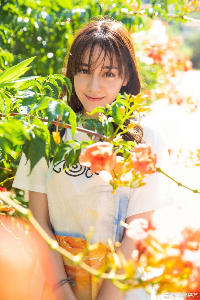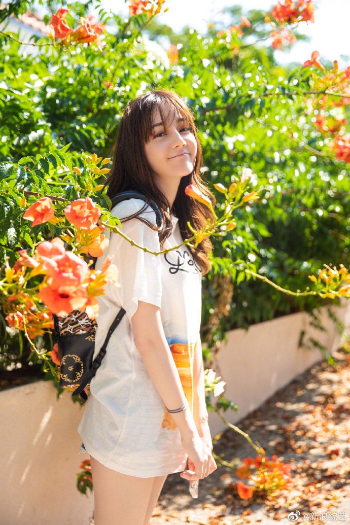 Địch Lệ Nhiệt Ba mặc áo thun trắng “lan đại địa” đơn giản cùng với những họa tiết màu sắc trong áo thun càng làm chỉnh thể và hiệu quả thị giác rất tốt, nhìn vào rất ưu nhã, thanh tân. Đồng thời tổng thể còn tăng thêm vài phần hoạt bát, nghịch ngợm.