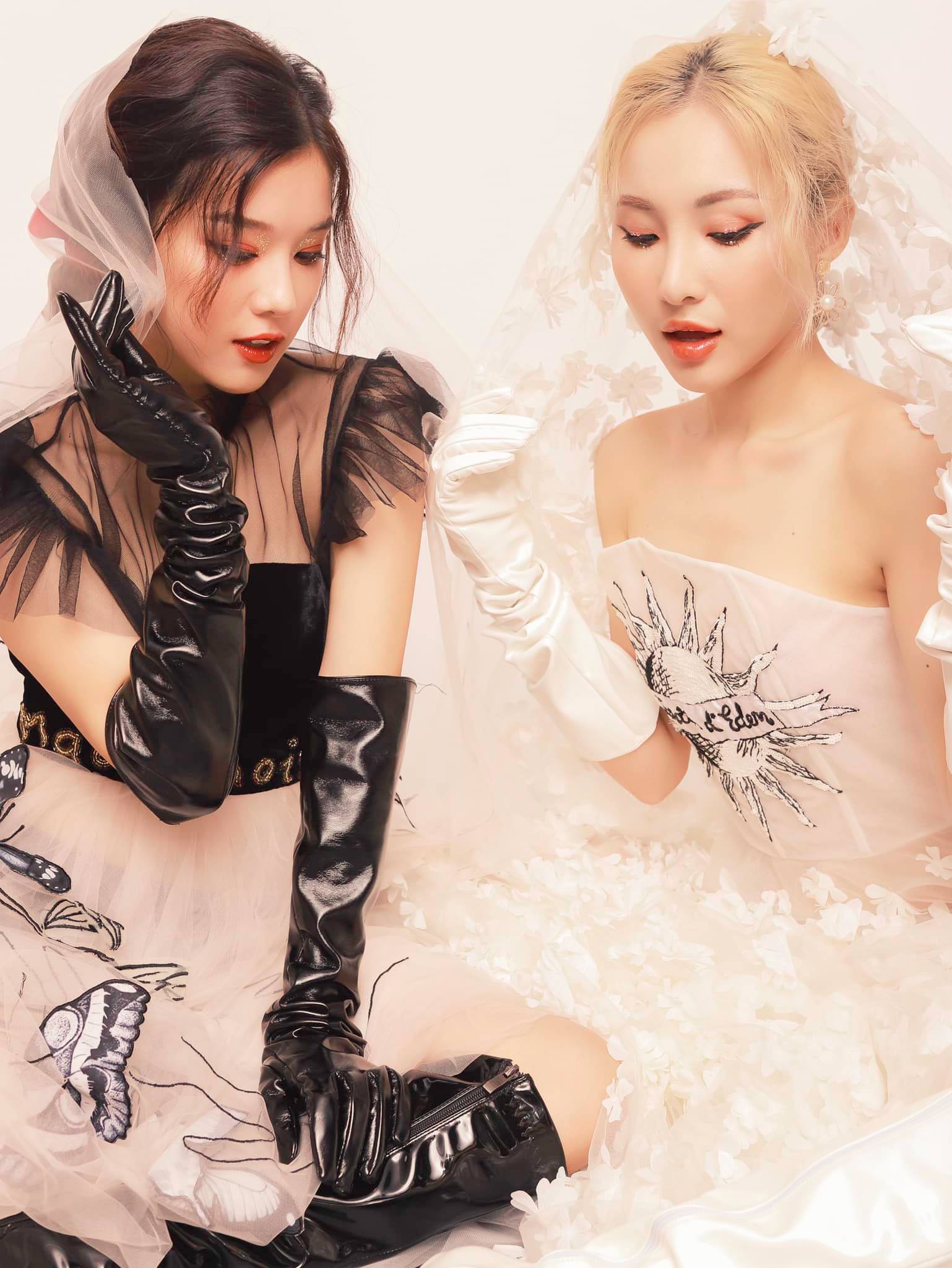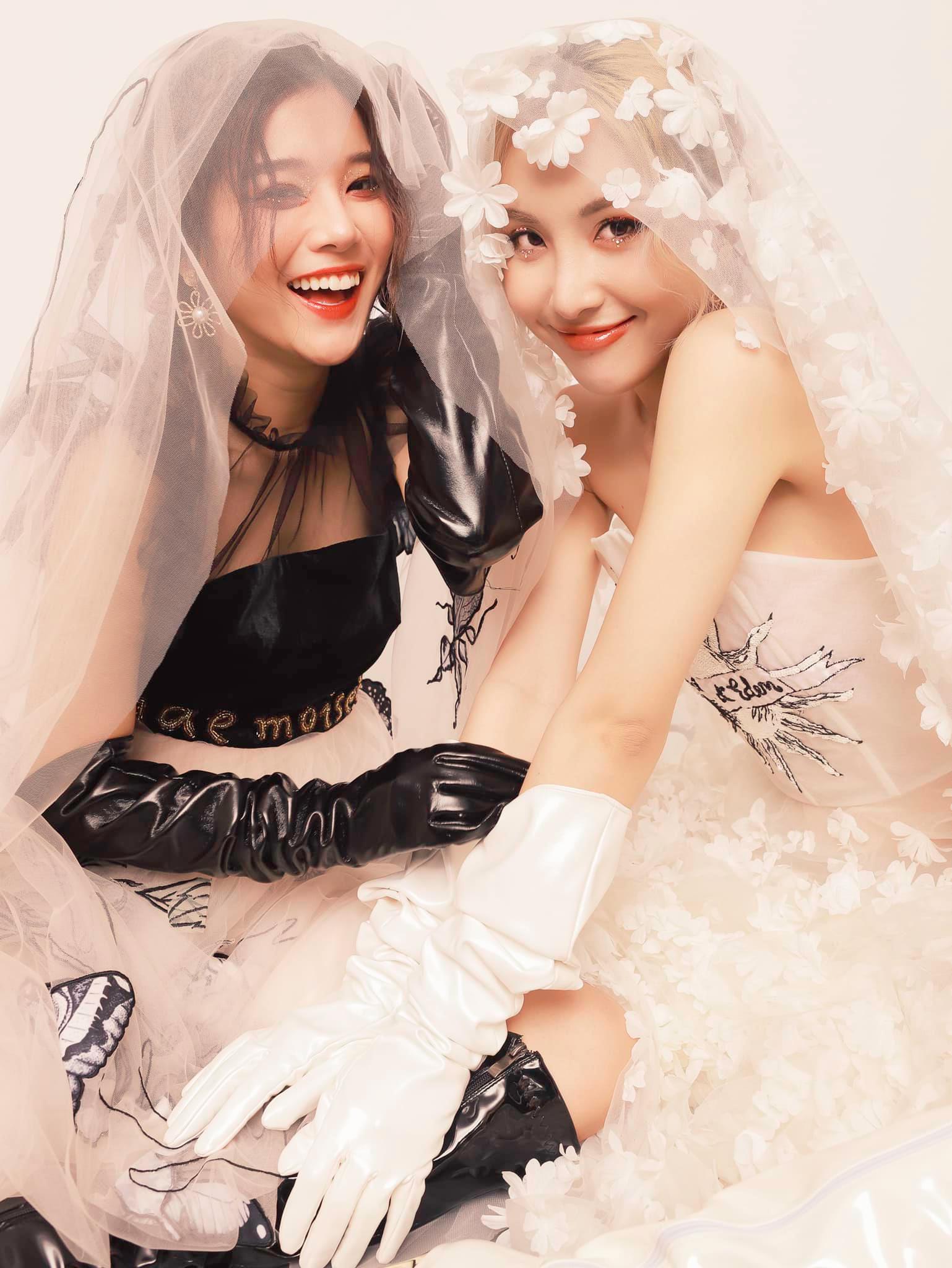 Không những vậy, khi hai cô nàng đội khăn voan lên đầu, hóa thành cô dâu 'hắc-bạch' đã khiến người hâm mộ 'ship' điên đảo.