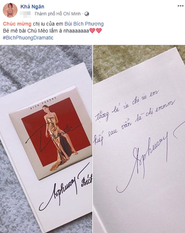 Vừa qua, nữ ca sĩ Bích Phương cho ra mắt album mới Dramatic cùng single thứ hai Chị ngả em nâng với hình ảnh mới lạ đầy ma mị gây ấn tượng mạnh cho khán giả. Vốn là bạn bè thân thiết, nữ ca sĩ đã ngay lập tức gửi tặng “đứa con tinh thần” của mình đến tay Khả Ngân cùng dòng đề tặng không thể đúng tinh thần sản phẩm hơn: “Tặng bé iu của chị, chị iu em. Kiếp sau vẫn là chị em“. Nữ diễn viên Hậu duệ Mặt Trời “ngay tắp lự” khoe ngay lên trang cá nhân cùng lời chúc mừng sản phẩm ra mắt thành công dành cho Bích Phương.