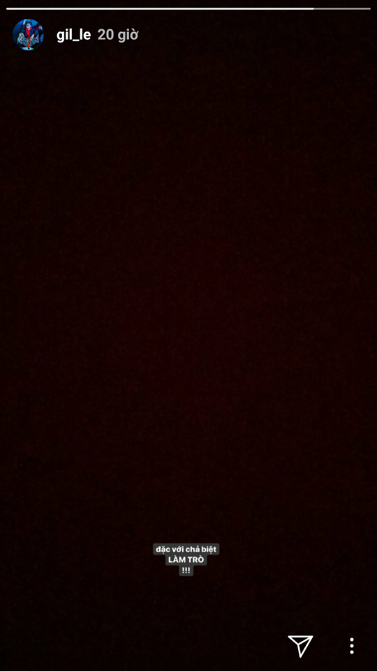 Trong khi khán giả còn đang hoang mang về hình ảnh này của Chi Pu thì trên trang cá nhân Instagram của Gil Lê bất ngờ có dòng chia sẻ trên Story: “Đặc với chả biệt, làm trò”. Điều này khiến không ít người cho rằng Gil Lê đang ngầm “đá xéo” Chi Pu về việc tẩy đi nốt ruồi trên mặt.