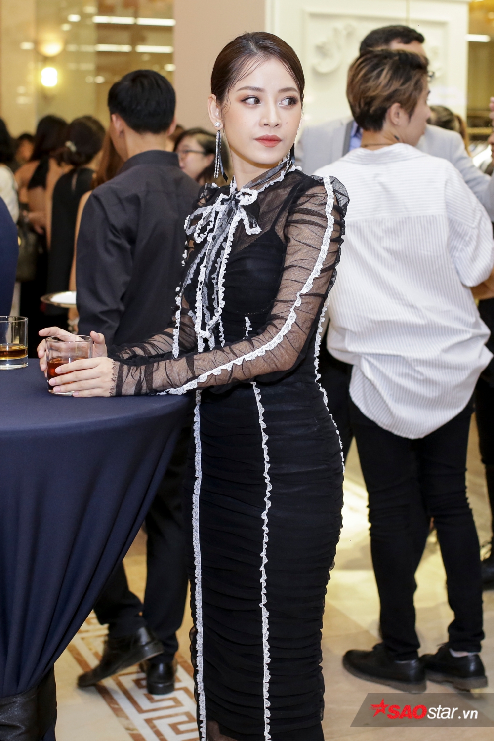 Chi Pu kín đáo với chiếc đầm đen dài xuyên thấu phần cánh tay với điểm nhấn là chiếc nơ lớn ở phần trước ngực.