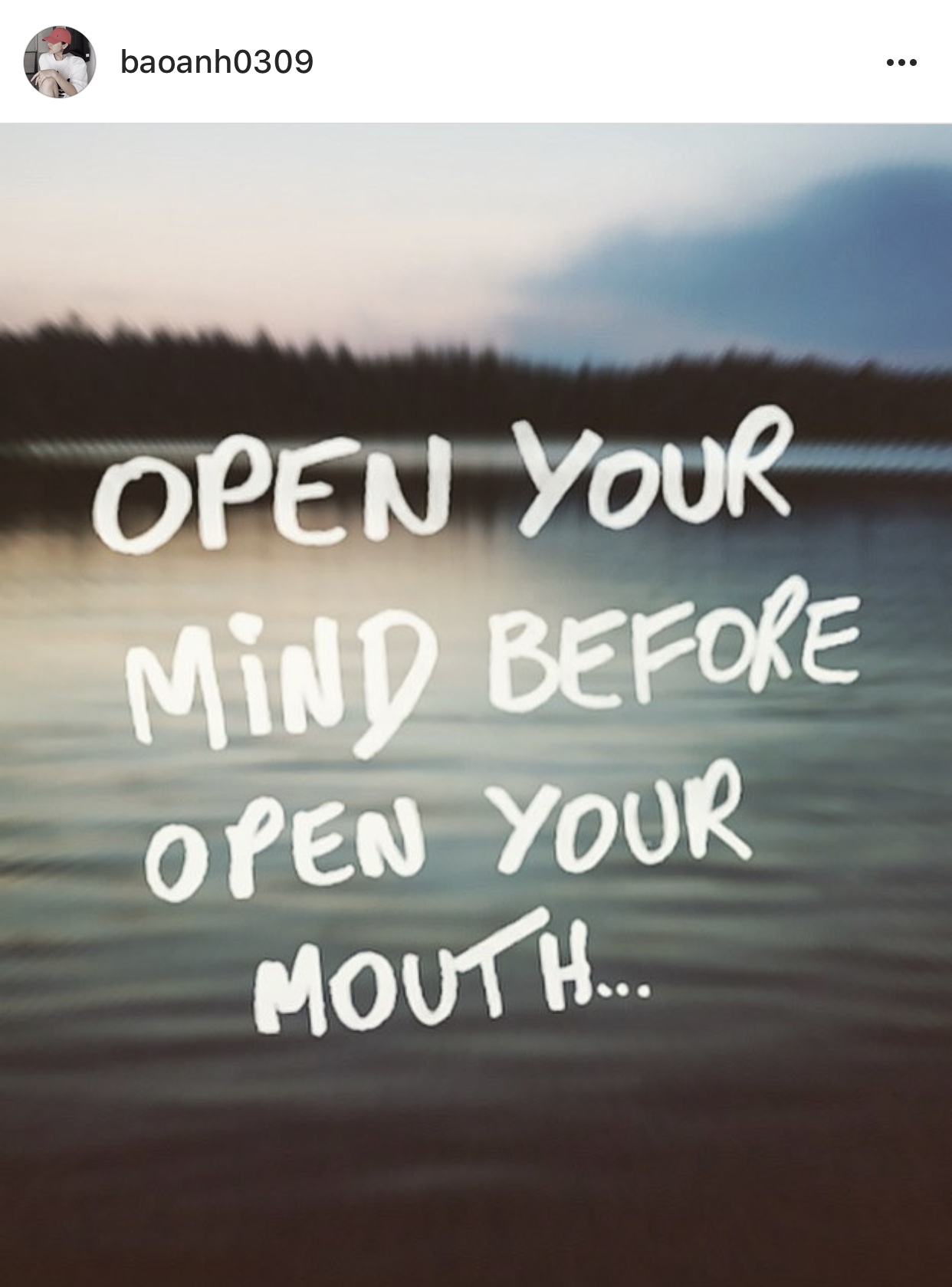 Thời gian gần đây, tin đồn tình cảm giữa Bảo Anh và Bùi Tiến Dũng trở thành đề tài gây xôn xao cộng đồng mạng. Giữa “bão” dư luận, người đẹp sinh năm 1992 đã có những chia sẻ mới nhất. Cụ thể, trên Instagram, giọng ca Anh muốn em sống sao đăng tải hình ảnh có nội dung: “Open your mind before open your mouth” (tạm dịch: Hãy suy nghĩ kĩ trước khi nói).