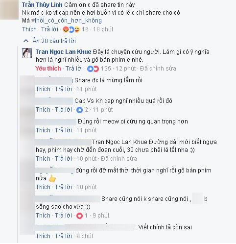 Tuy nhiên, hành động chia sẻ của Lan Khuê ngay lập tức bị một nhóm anti-fan đem ra chỉ trích, trách móc. Họ cho rằng nữ HLV The Face chỉ “làm cho có” vì cô không hề viết bất cứ điều gì. Không chịu để yên, Lan Khuê liền đáp trả khiến nhiều người hâm mộ vô cùng phấn khích trước thái độ thẳng thắn, bộc trực. Cô nói: “Đây là chuyện cứu người. Làm gì có ý nghĩa hơn là nghĩ nhiều và gõ bàn phím em nhé!”