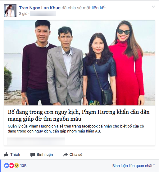 Lan Khuê chia sẻ về bệnh tình của bố Phạm Hương trên trang cá nhân.