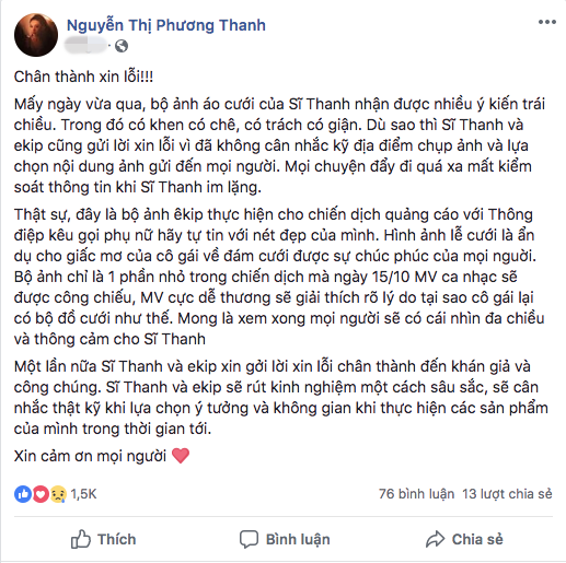 Toàn bộ lời xin lỗi của Sĩ Thanh được chia sẻ trên trang cá nhân của cô cùng những lời giải thích về ý nghĩa bộ ảnh cưới có phần “không hợp mắt” này.
