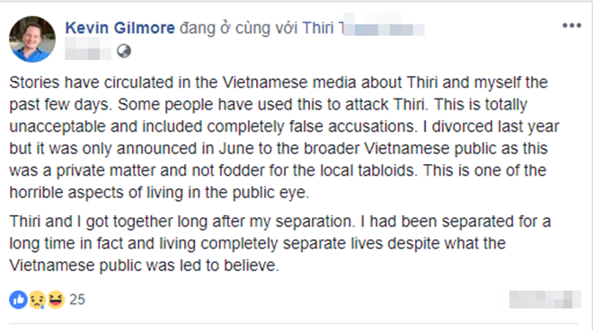 Kevin viết rằng “Về những tin tức và truyền thông Việt Nam đã viết trong những ngày qua về tôi và Thiri, tôi bắt buộc phải lên tiếng. Một số người đã sử dụng nó để công kích Thiri và điều này hoàn toàn không được chấp nhận và sự suy diễn đó là sai.