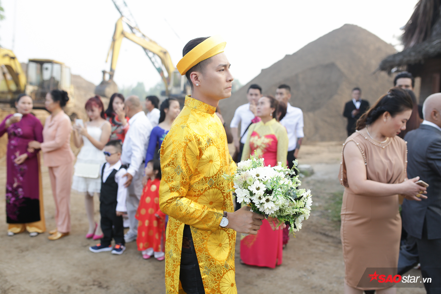 Ông xã kém 8 tuổi của Lâm Khánh Chi nổi bật với áo dài vàng, hồi hộp trong ngày trọng đại.