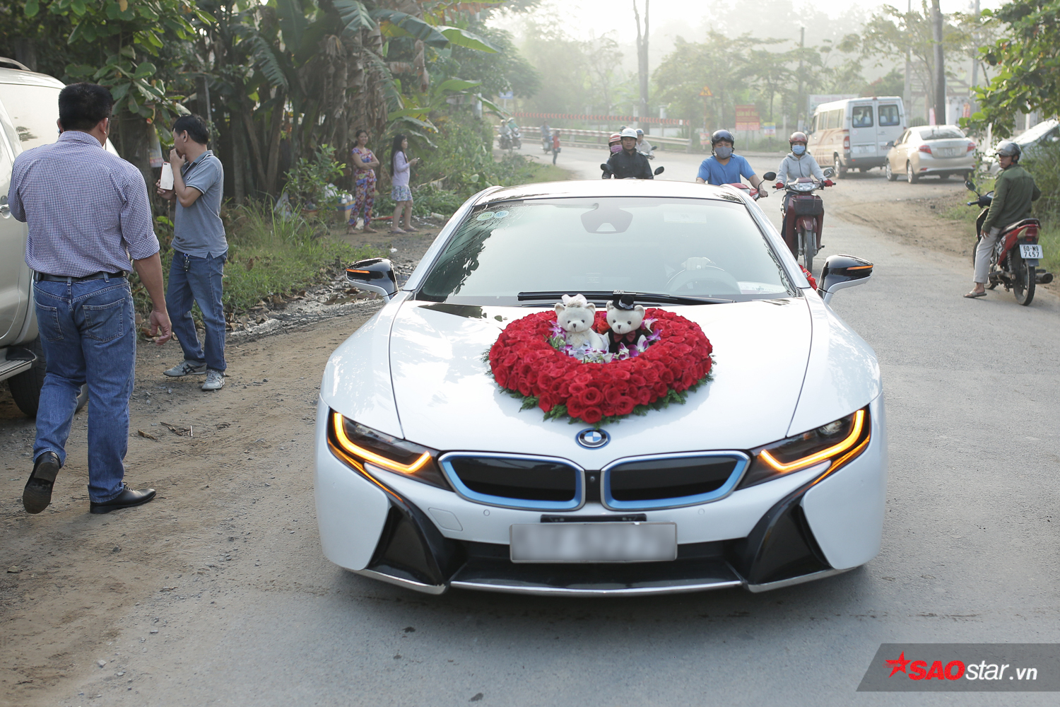 Đúng 7h sáng, xe hoa của chú rể Trần Phi Hùng có mặt trước nhà cô dâu.