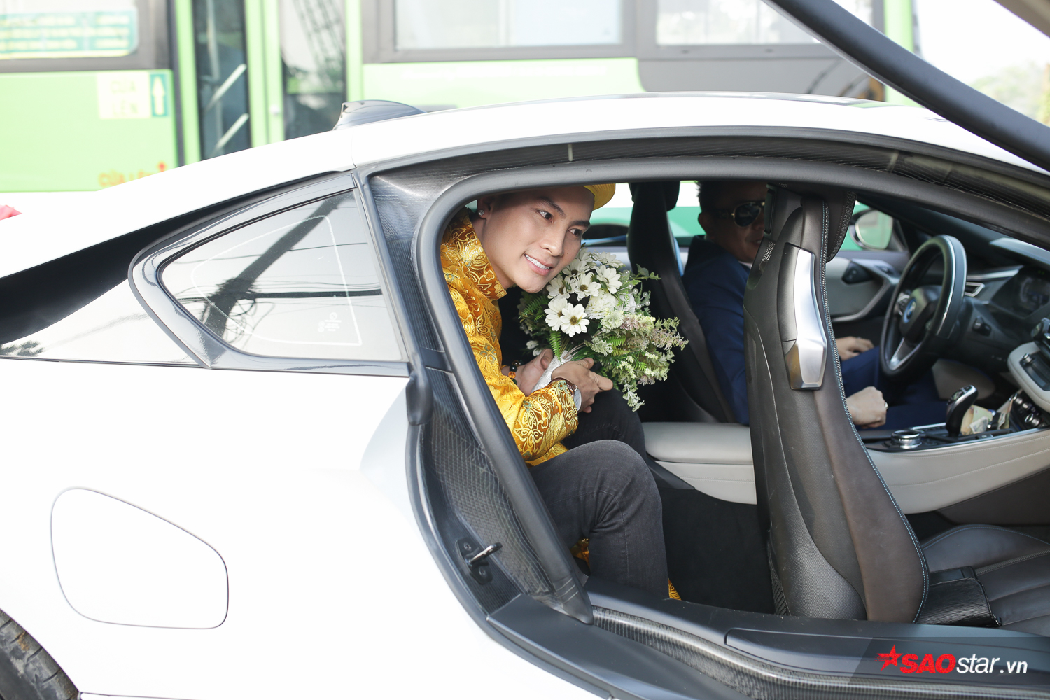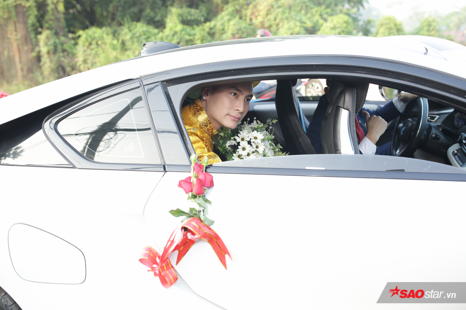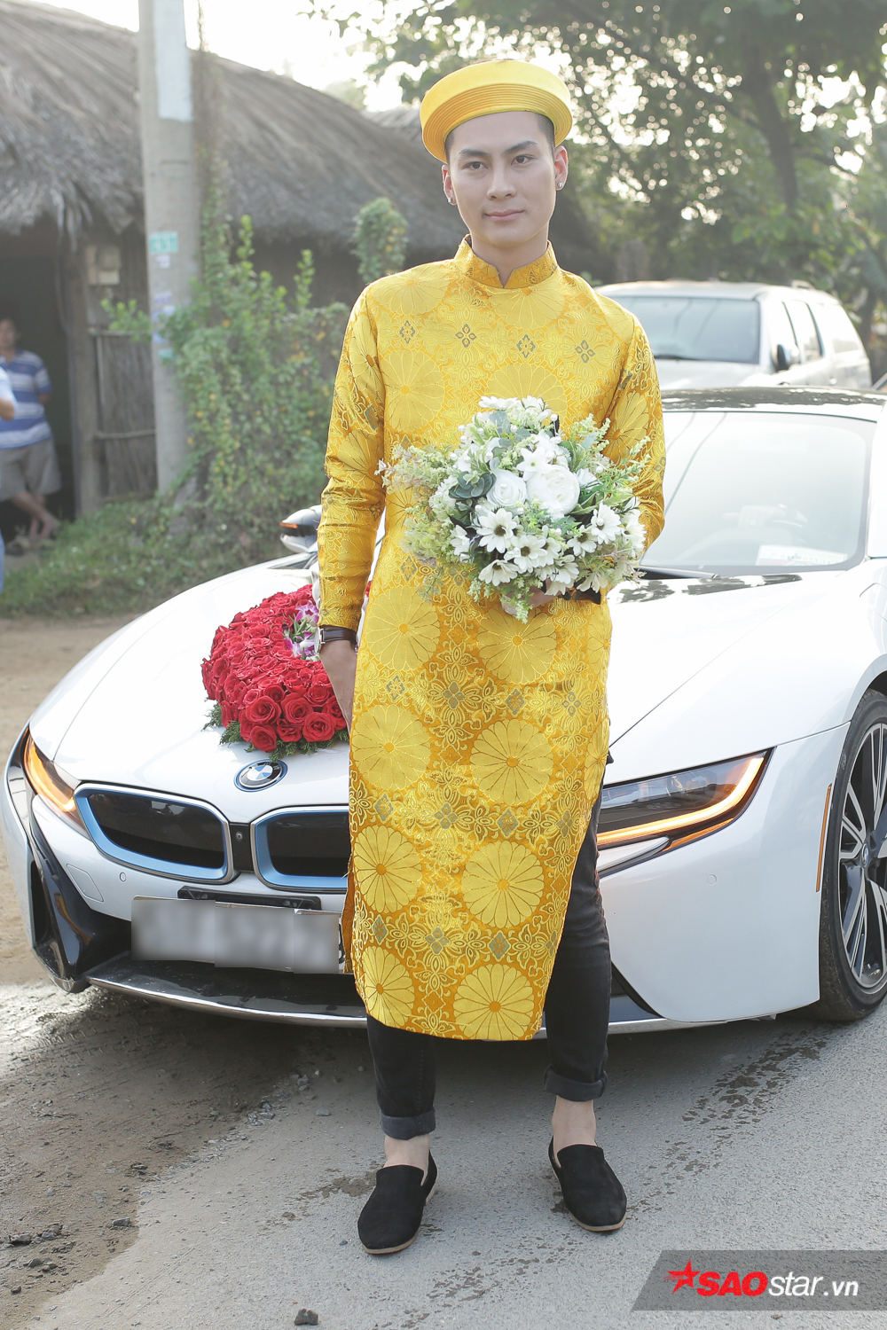 Đúng 7h, xe hoa của chú rể Trần Phi Hùng thẳng tiến đến nhà cô dâu. Ông xã điển trai của Lâm Khánh Chi diện áo dài vàng nổi bật. Trước khi bước vào nhà vợ, ông xã Lâm Khánh Chi liên tục bận rộn với những cuộc điện thoại. Trên gương mặt anh thể hiện sự lo lắng rõ rệt.