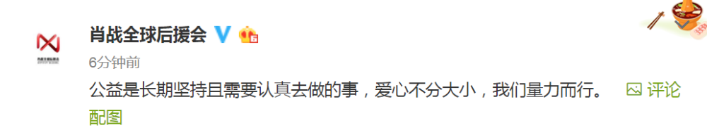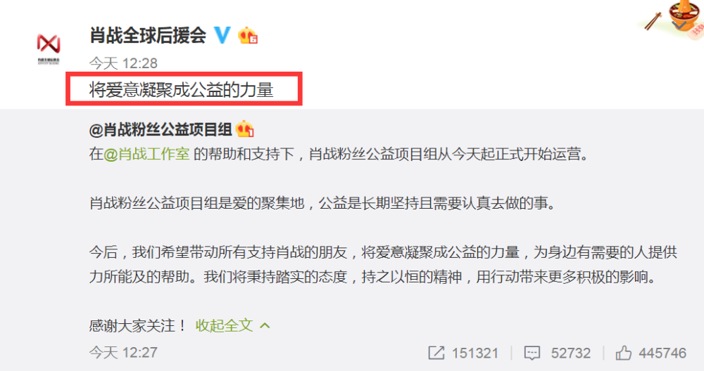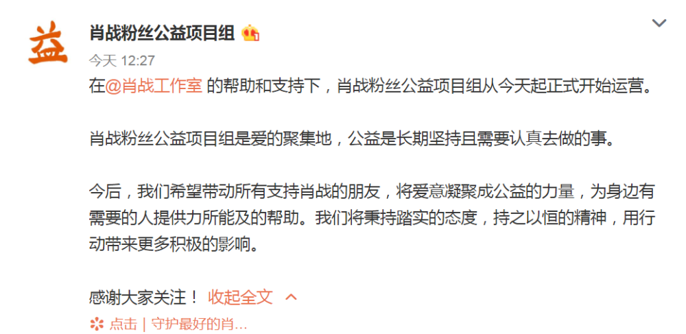 Ngày 21 tháng 3, một tài khoản weibo có tên Tổ hạng mục công ích fan hâm mộ Tiêu Chiến xuất hiện trên weibo chính của “Hậu hội viện toàn cầu Tiêu Chiến”. Weibo này còn kèm bài viết: “Công ích là sự kiên trì trường kỳ, đồng thời cần phải nghiêm túc làm việc, tấm lòng yêu thương không phân lớn nhỏ, dựa vào sức lực chúng ta mà làm“, đồng thời còn chia sẻ bài viết: “Đem tình yêu thương kết tụ thành sức mạnh công ích”, thừa nhận “Hạng mục công ích của fan hâm mộ Tiêu Chiến” lần này là tài khoản công ích được phòng làm việc Tiêu Chiến thừa nhận, ủng hộ và giúp đỡ.