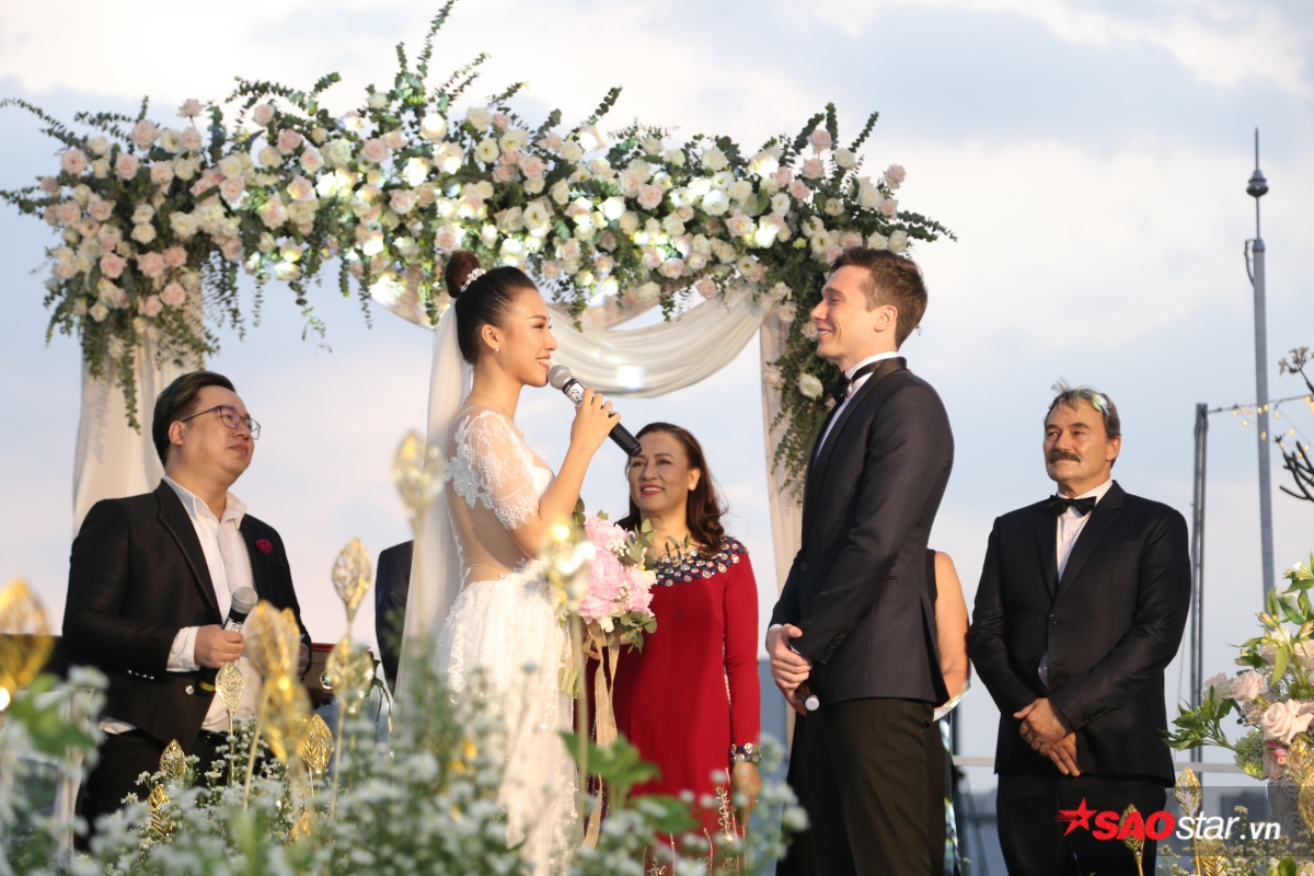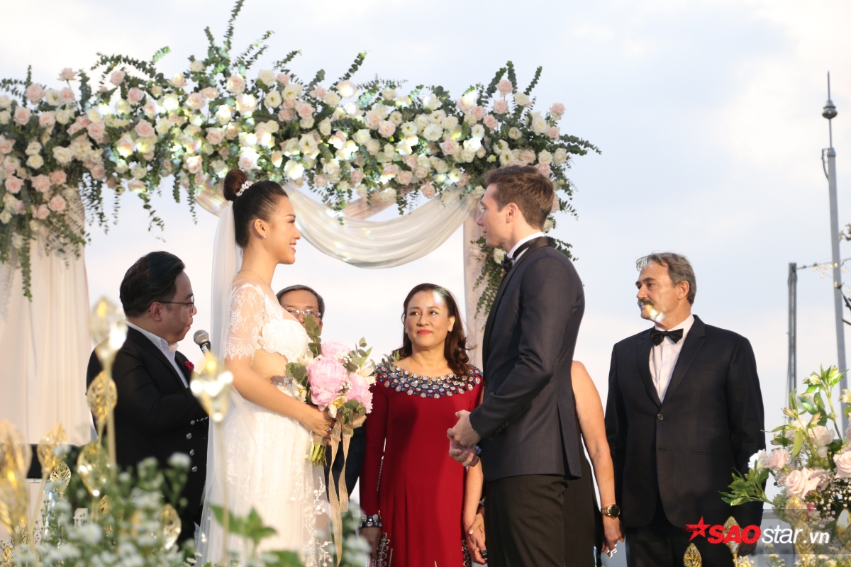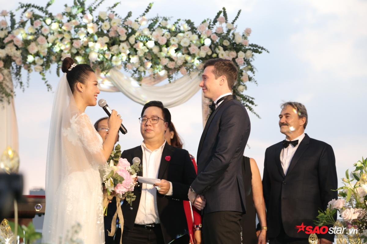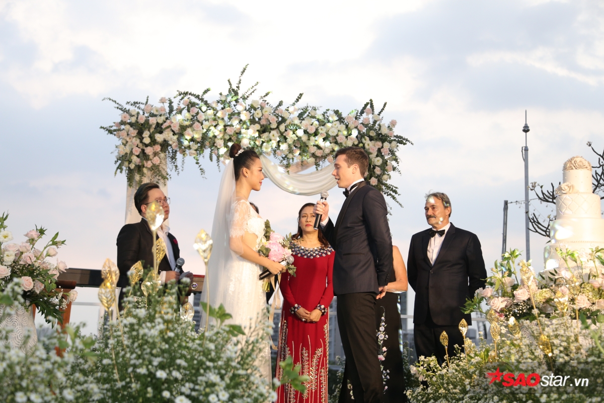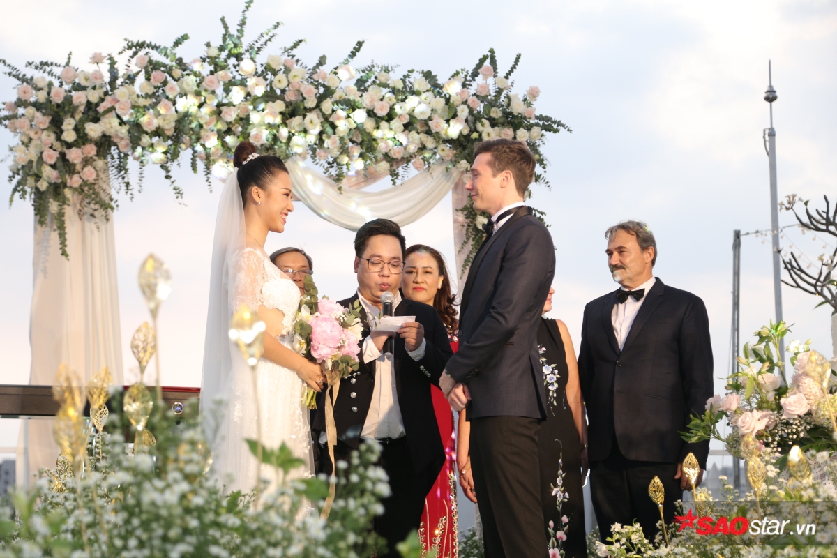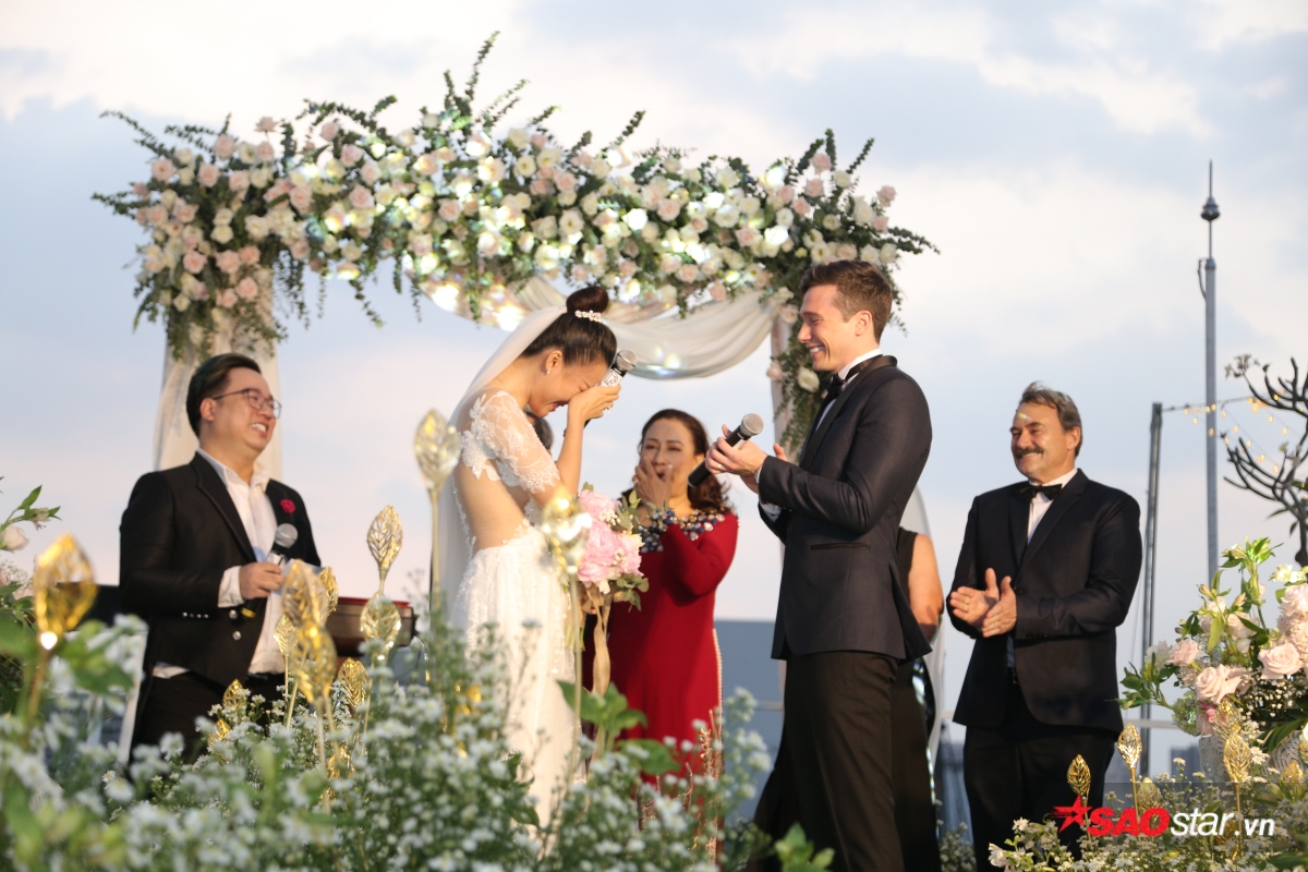 Giây phút trao lời ước hẹn trăm năm, MC Tùng Leo giữ vai trò người chủ hôn bằng song ngữ. Chú rể Jack xúc động hứa sẽ yêu thương và chăm sóc Hoàng Oanh suốt đời. Chưa dừng lại ở đó, anh tiếp tục bập bẹ tiếng Việt câu nói không thể ngọt ngào hơn: “Anh thương em nhiều lắm“.