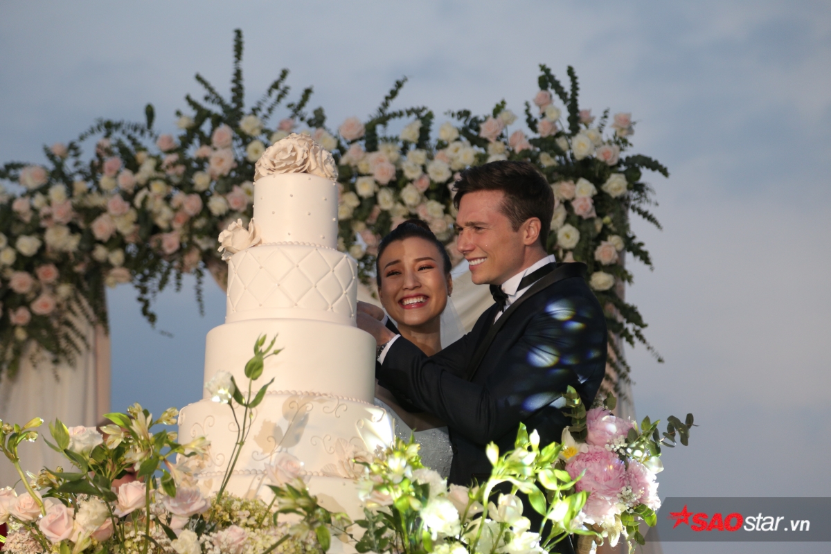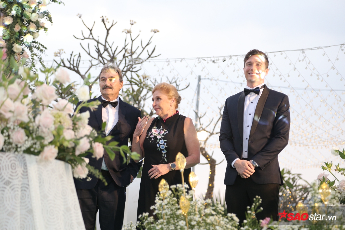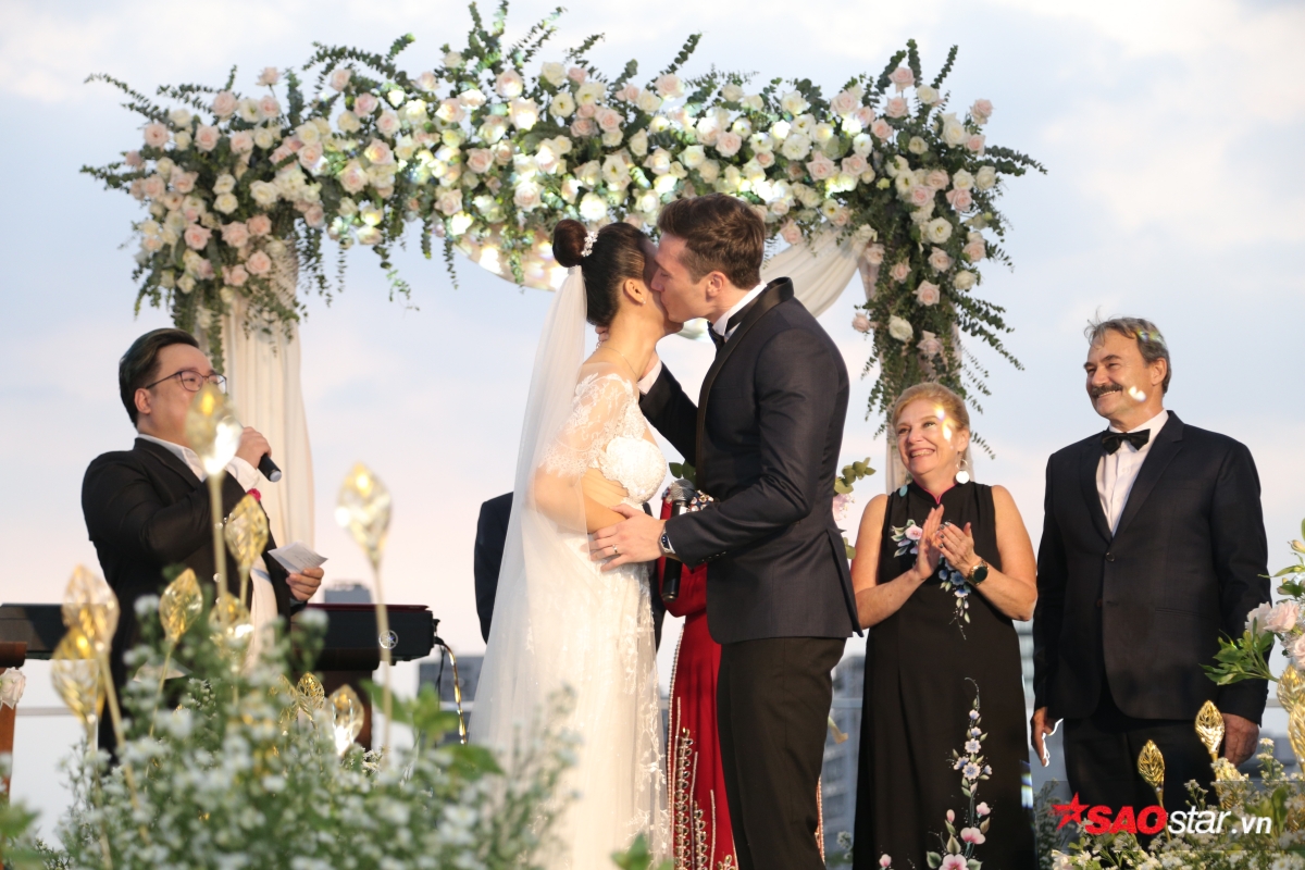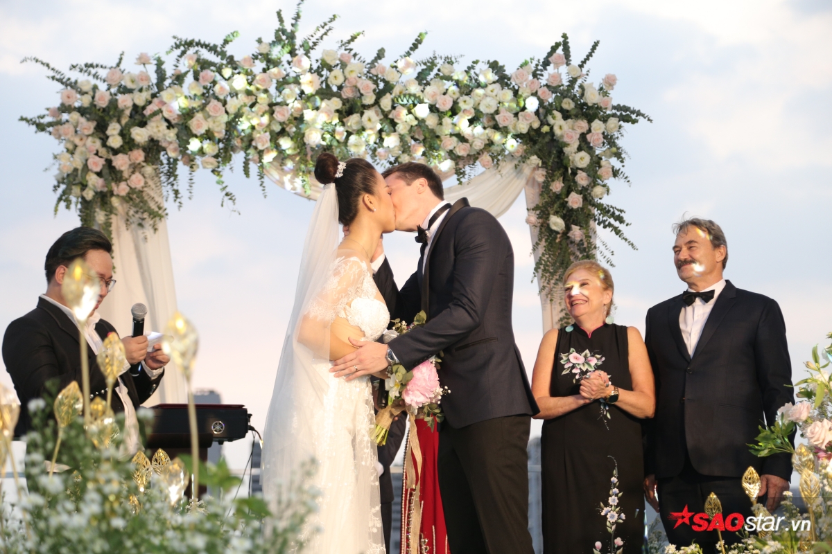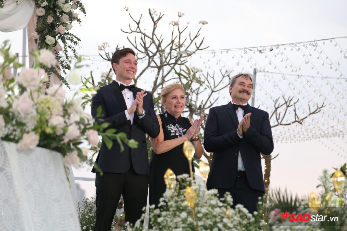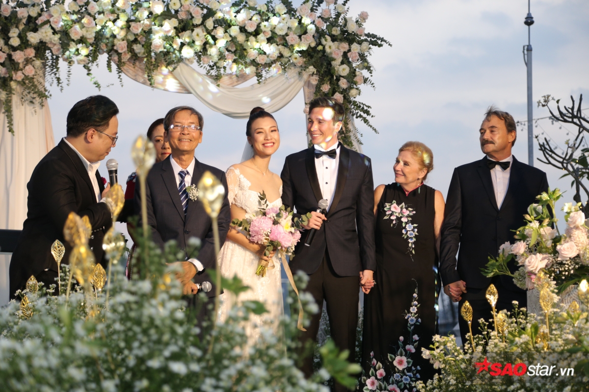 Giây phút trao lời ước hẹn trăm năm, MC Tùng Leo giữ vai trò người chủ hôn bằng song ngữ. Chú rể Jack xúc động hứa sẽ yêu thương và chăm sóc Hoàng Oanh suốt đời. Chưa dừng lại ở đó, anh tiếp tục bập bẹ tiếng Việt câu nói không thể ngọt ngào hơn: “Anh thương em nhiều lắm“.