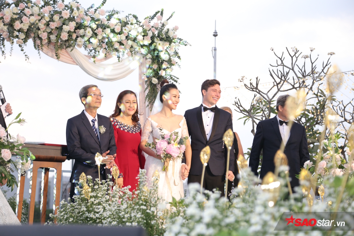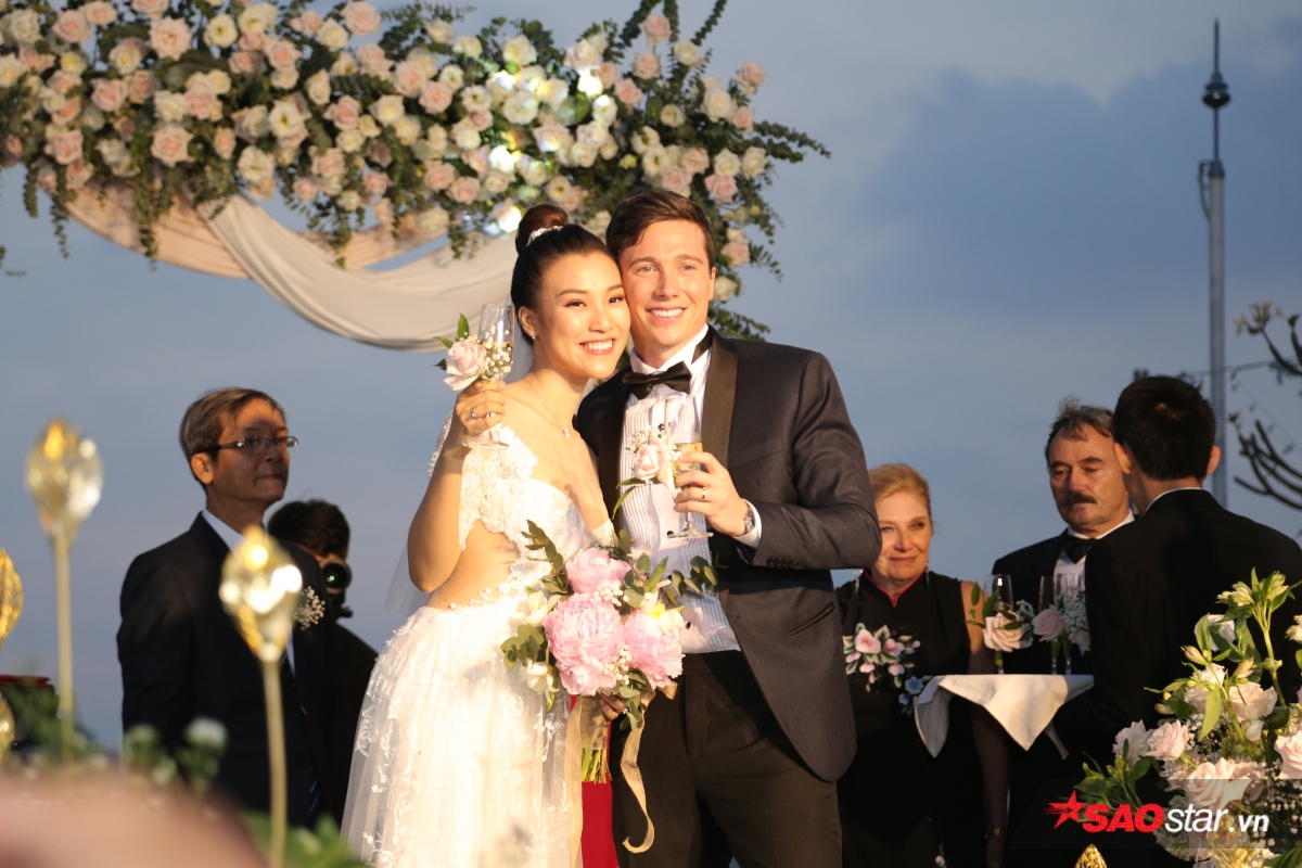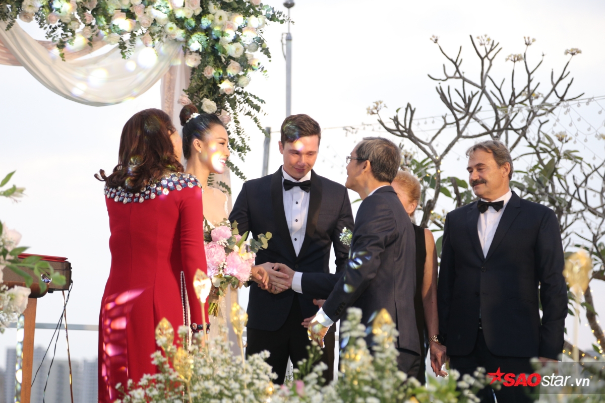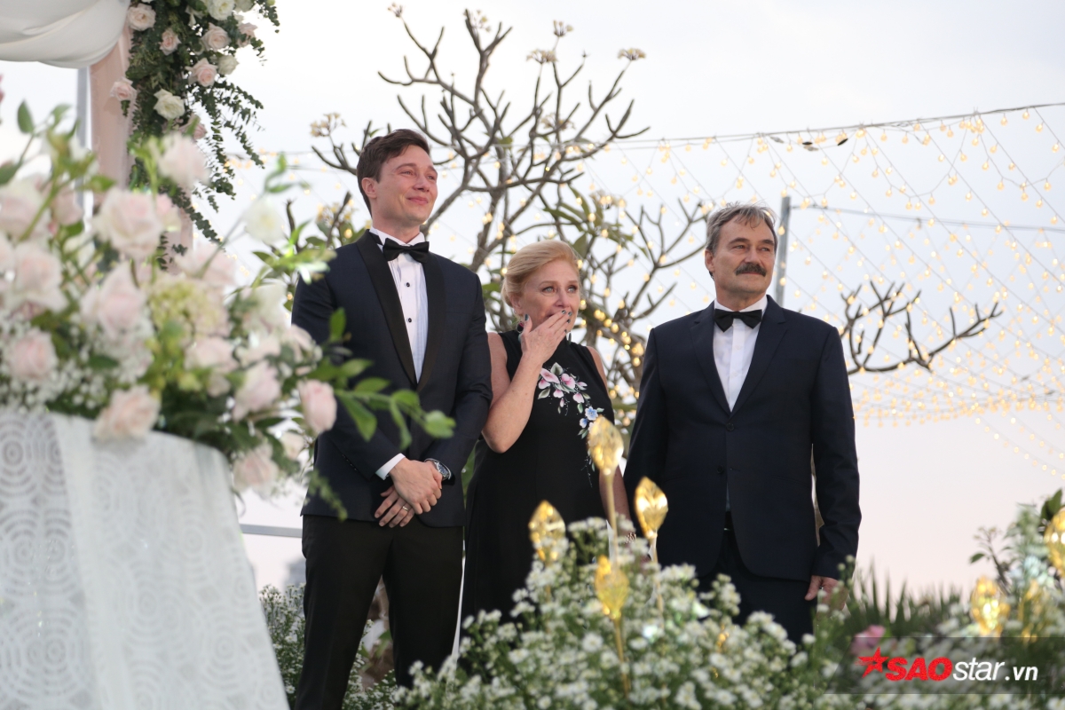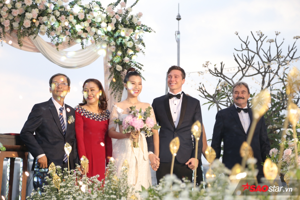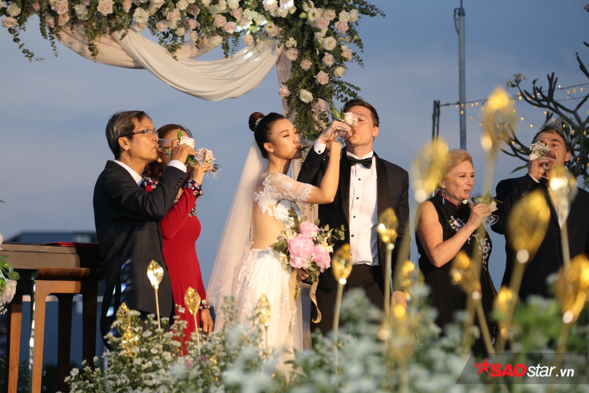 Giây phút trao lời ước hẹn trăm năm, MC Tùng Leo giữ vai trò người chủ hôn bằng song ngữ. Chú rể Jack xúc động hứa sẽ yêu thương và chăm sóc Hoàng Oanh suốt đời. Chưa dừng lại ở đó, anh tiếp tục bập bẹ tiếng Việt câu nói không thể ngọt ngào hơn: “Anh thương em nhiều lắm“.