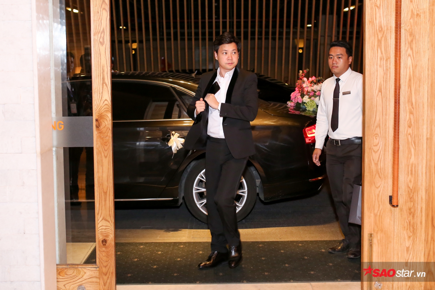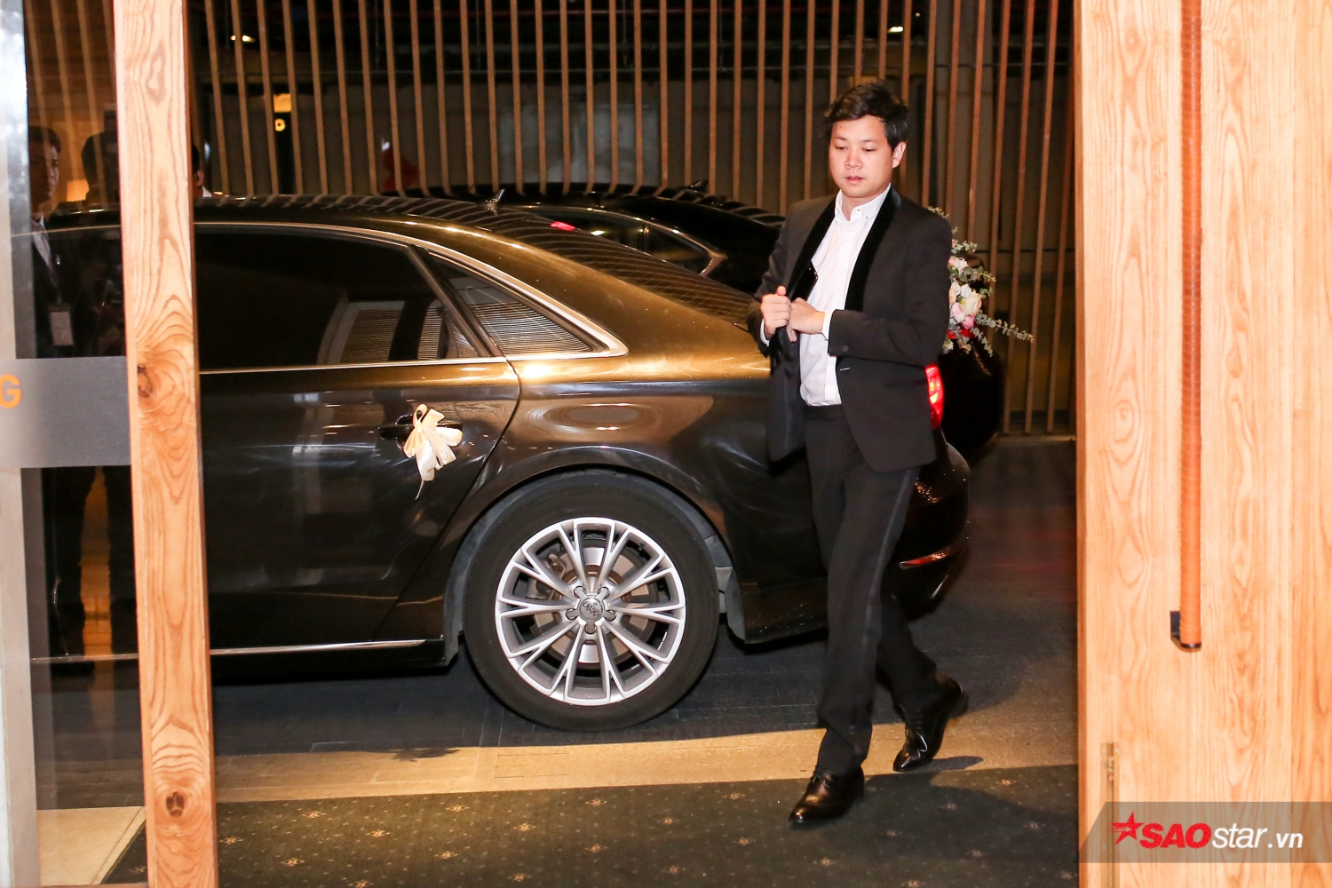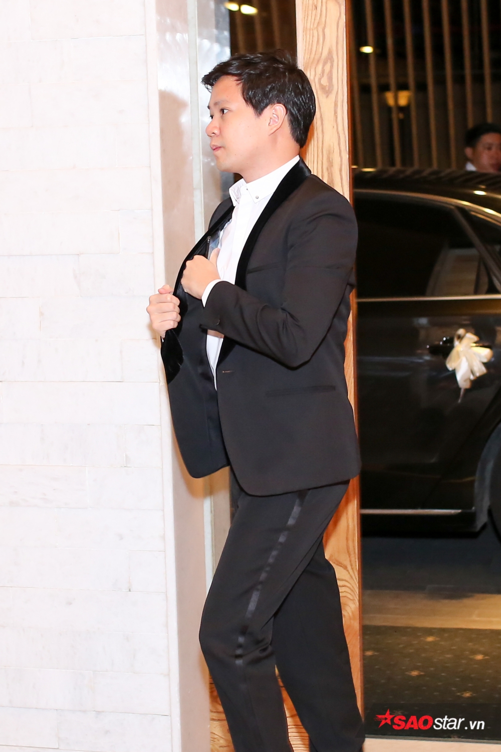 Chú rể Trung Tín xuất hiện tại trung tâm tổ chức tiệc cưới.