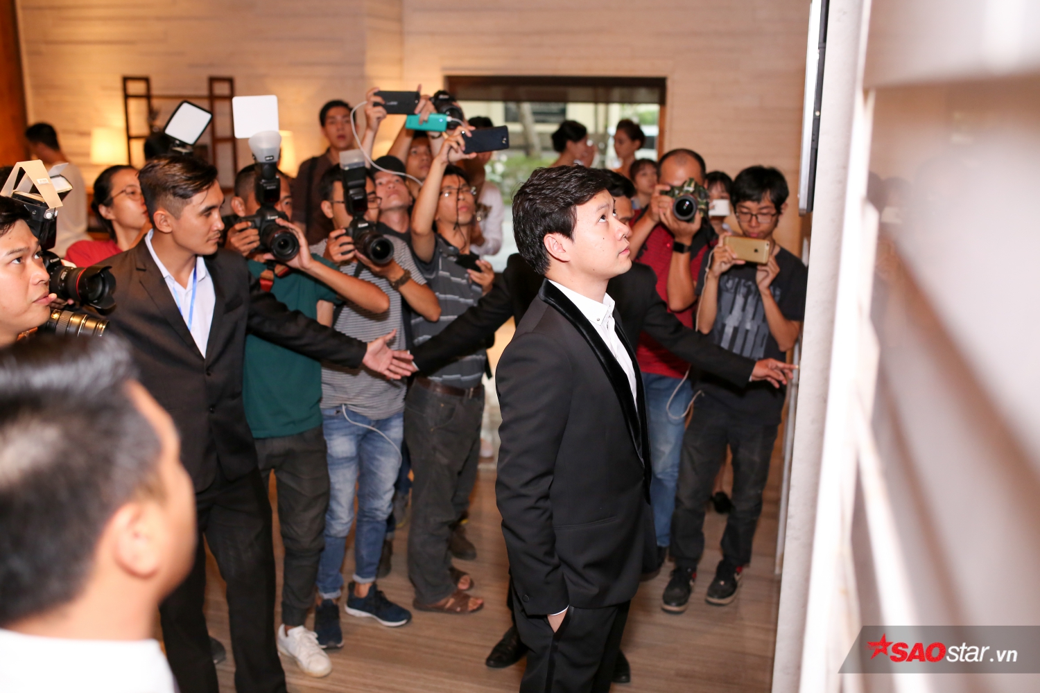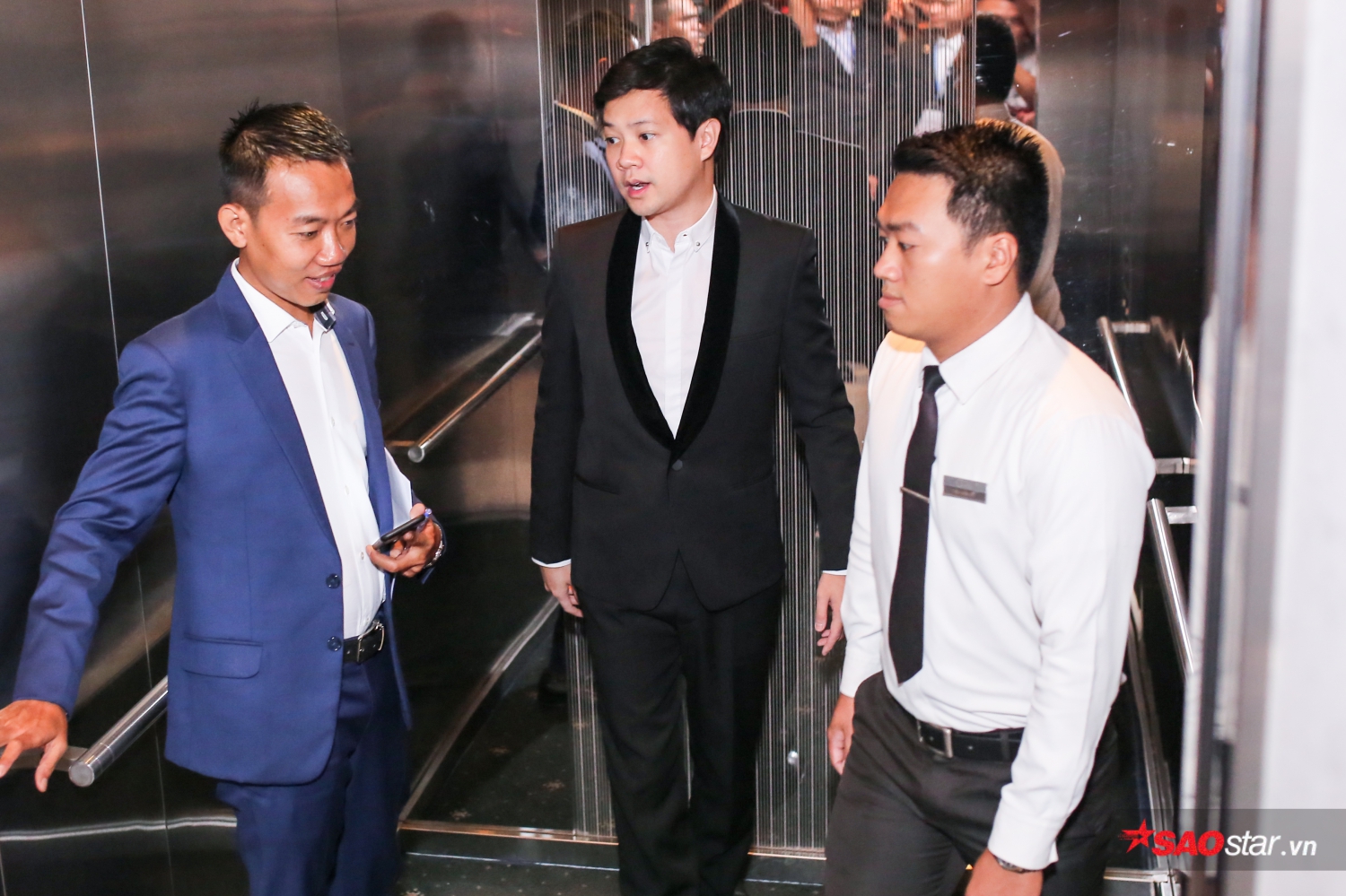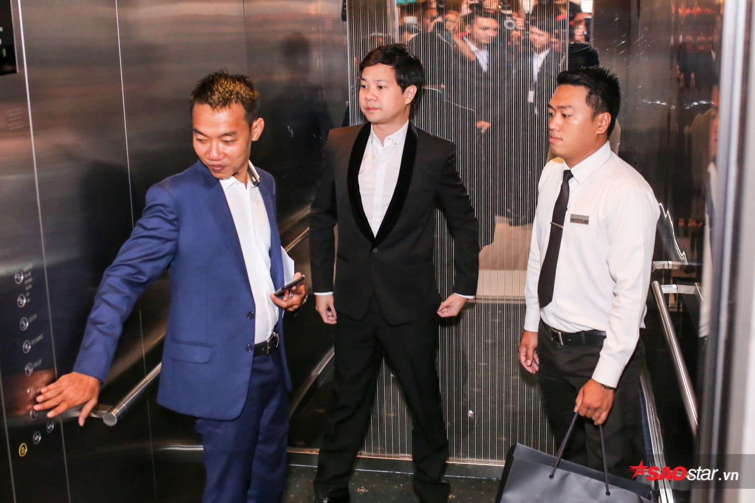 Chú rể Trung Tín nhanh chóng di chuyển đến thang máy để lên sảnh tiệc.