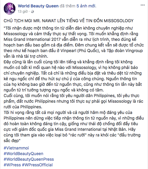 “Tôi nhận được một thông tin từ diễn đàn không chuyên nghiệp như Missosology và cảm thấy thực sự thất vọng. Tôi muốn khẳng định rằng Miss Grand International 2017 vẫn diễn ra như lịch trình, theo đúng kế hoạch ban đầu bao gồm cả địa điểm. Đêm chung kết vẫn sẽ được tổ chức theo như kế hoạch ban đầu ở Vinpearl (Phú Quốc), và Tập đoàn Vingroup vẫn là nhà tài trợ chính. Đây cũng là lần cuối cùng tôi lên tiếng và khẳng định rằng tôi không muốn có bất kỳ mối quan hệ nào với Missosology, vì họ không phải báo chí chuyên nghiệp.
