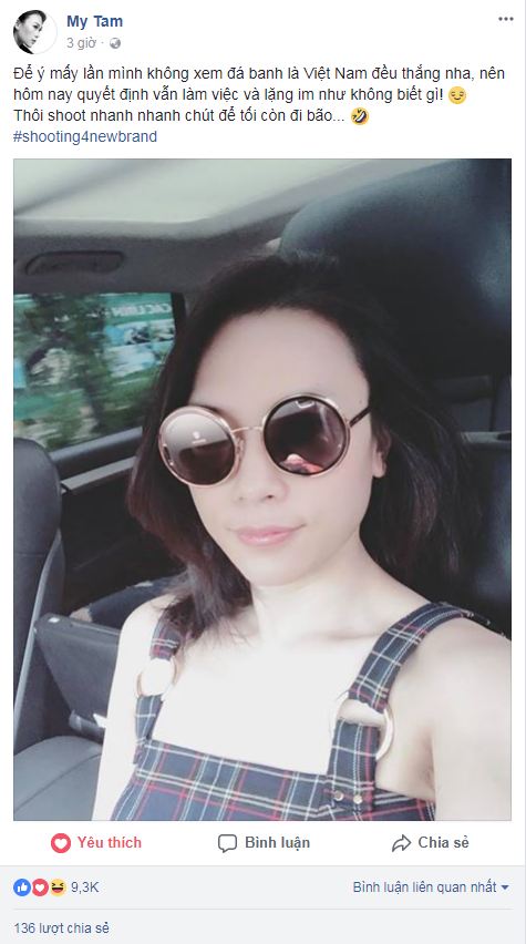Trước đó, Mỹ Tâm chia sẻ do bận lịch chụp ảnh nên không thể theo dõi trọn vẹn trận đấu đầy căng thẳng giữa U23 Việt Nam và U23 Qatar. Tuy nhiên, cô cũng hứa sẽ hoàn thành công việc sớm để cùng mọi người xuống đường, đi “bão”.