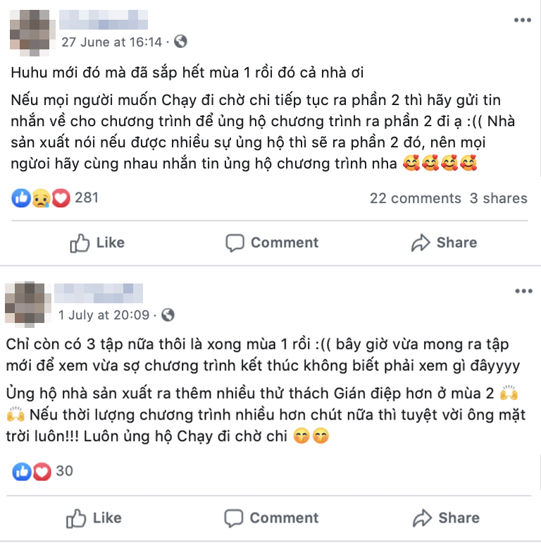 Người hâm mộ của “Chạy đi chờ chi” còn kêu gọi ủng hộ chương trình bằng cách nhắn tin về cho chương trình để tiếp thêm động lực cho nhà sản xuất.