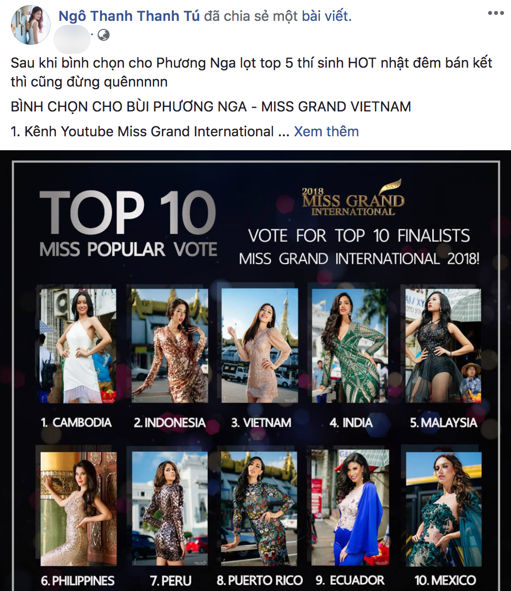 Dù cũng đang bận rộn “chinh chiến” tại Miss International 2018 nhưng Thùy Tiên vẫn không quên vận động bình chọn cho Phương Nga.