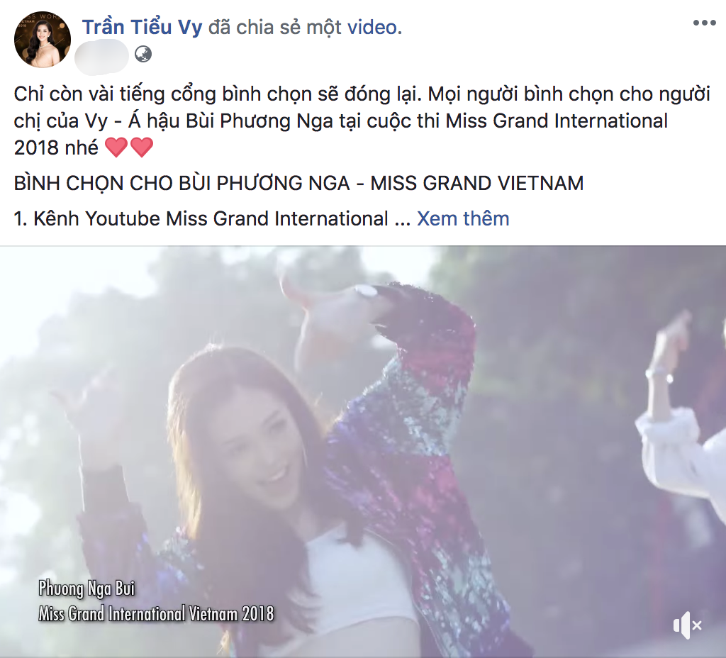 Hoa hậu Trần Tiểu Vy hẳn nhiên không thể thiếu trong danh sách “hội chị em” đứng ra kêu gọi bình chọn cho Phương Nga.