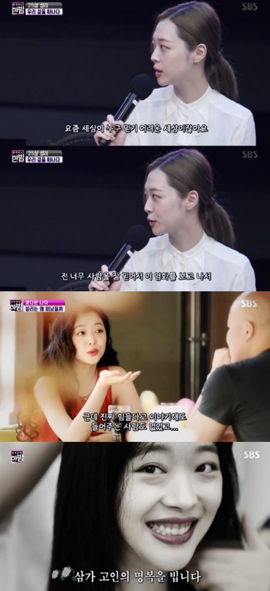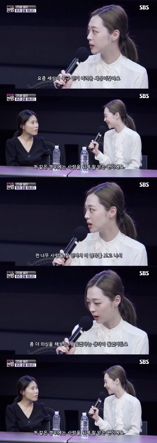 Khi chia sẻ suy nghĩ của mình sau khi xem phim, Sulli bày tỏ: “Tôi là kiểu người dễ dàng tin tưởng người khác. Nhưng ngày nay, thế giới là nơi khó tin tưởng bất cứ ai. Chính vì vậy, sau khi xem bộ phim này, tôi nghĩ rằng có lẽ việc người khác trở nên nghi ngờ nhiều hơn là một điều nên làm”.