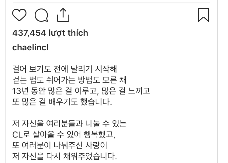“Giống như Chaelin 13 tuổi, giống như bà tôi luôn nói với tôi, một cách dũng cảm và tự tin. Không đợi người khác thúc giục và điều khiển, tôi sẽ trở lại làm CL và tự mình tiến về phía trước, từng bước một.”