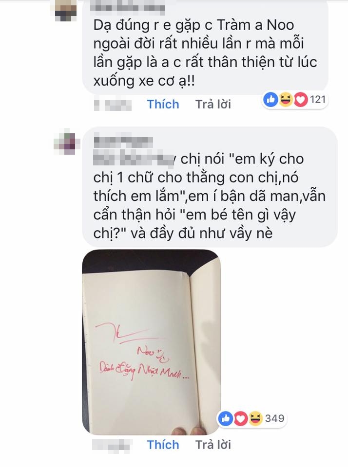 Chia sẻ trên nhanh chóng nhận được sự quan tâm của cư dân mạng, thậm chí một tài khoản còn góp thêm vào hình ảnh Noo Phước Thịnh ký tặng cho con trai mình cùng lời kể dù đang bận rộn nhưng khi được khán giả đề nghị ký tên, nam ca sĩ vẫn vui vẻ hỏi thông tin để cẩn thận ghi lời đề tặng. Chỉ một hành động nhỏ thôi nhưng có lẽ cũng đủ để fan phải “đổ rầm rầm” vì độ đáng yêu quá mức của anh.