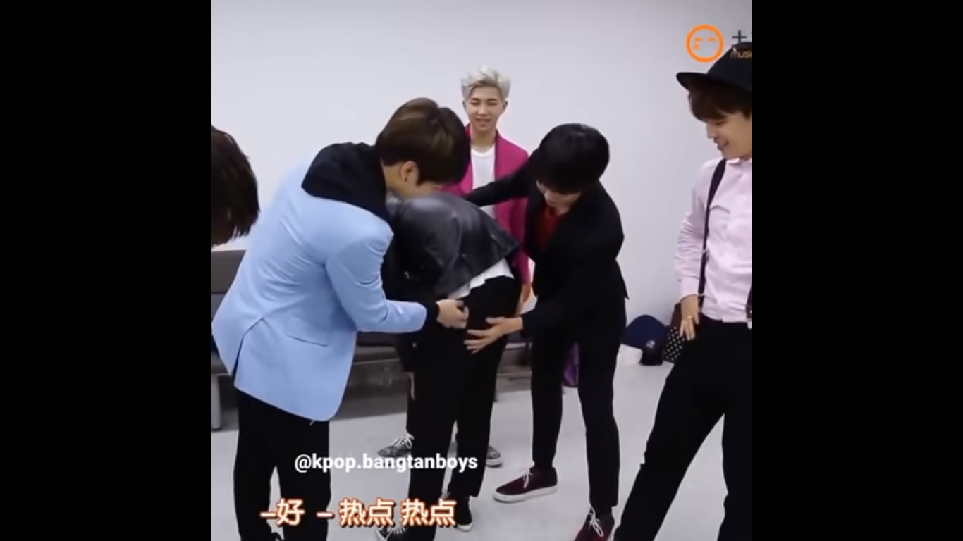 Còn nhớ lần đầu tiên các thành viên “vỗ mông” nhau là trong MV War of Hormone và sau đó trò chơi lạ lẫm này đã theo BTS đi khắp các game show. Hình phạt này luôn khiến cho nạn nhân đỏ cả mặt vì ngại ngùng nhưng các thành viên còn lại thì có một trận cười hả hê, thích thú.