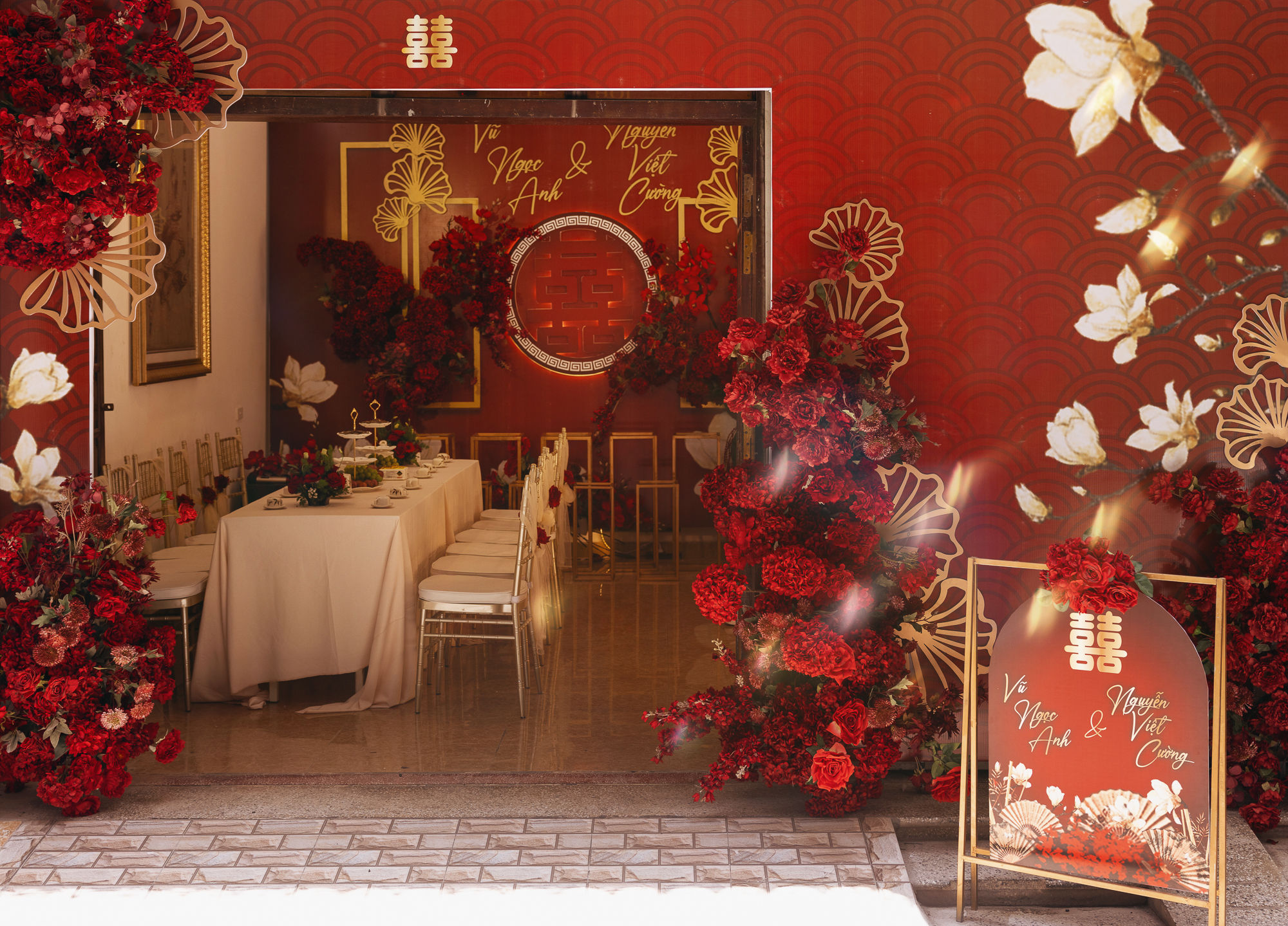 Đám cưới sử dụng hơn 3.000 bông hoa gồm hoa hồng, cẩm tú cầu, mẫu đơn và mộc lan chỉ với tone màu đỏ để làm nổi bật lên vẻ đẹp của phương Đông. Từng chi tiết vật dụng trang trí được chăm chút cẩn thận để concept được bám sát nhất, từ chữ hỉ cắt xốp, bộ ấm chén gốm Bát Tràng in hình cây tre,...