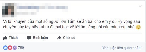 Mới đây, chủ nhân của những dòng bức xúc vào đêm qua tiếp tục có những phản hồi trên trang cá nhân. Tuy nhiên, thay vì nói về những chuyện đã xảy ra thì cô gái bất ngờ chia sẻ: “Vì lời khuyên của một số người lớn, Tấm sẽ ẩn bài cho em ý đi. Hy vọng sau chuyện này My hãy rút ra được bài học về lời ăn tiếng nói của mình em nhé”.