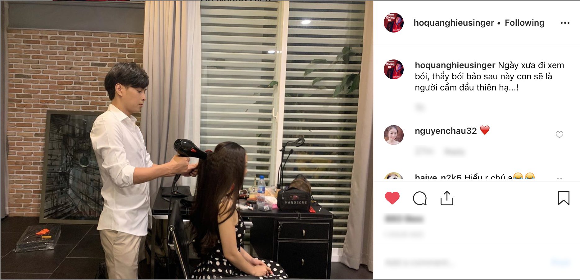 Mới đây, trên trang tài khoản cá nhân, Hồ Quang Hiếu bất thình lình đăng tải hình ảnh thân mật với một cô gái lạ. Theo đó, nam ca sĩ có cử chỉ “chải tóc” cho cô gái kèm theo dòng chia sẻ: “Ngày xưa đi xem bói, thầy bói bảo sau này sẽ có người cầm đầu thiên hạ!”.
