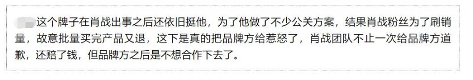 Gần đây, một số cư dân mạng đã vạch trần tin tức ám chỉ về Tiêu Chiến: “Một thương hiệu trang điểm nào đó không chỉ hỗ trợ anh ta sau cơn bão tẩy chay mà còn đầu tư rất nhiều phí quan hệ công chúng. Kết quả, người hâm mộ Tiêu Chiến cố tình mua sản phẩm theo lô và trả lại những món hàng“. Ngoài ra, theo thông tin này còn cho biết: “Đoàn đội của nam lưu lượng vội vã xin lỗi và đền bù khoản tiền cho thương hiệu sau những rắc rối liên tiếp do fan hâm mộ gây ra. Nhưng thái độ của phía thương hiệu rất lạnh nhạt với nam minh tinh lưu lượng”.
