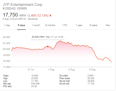 Trên KOSDAQ (Báo giá tự động của đại lý chứng khoán Hàn Quốc), giá cổ phiếu của JYP Entertainment đang ở mức 17.750 won (khoảng 338 nghìn đồng) cho mỗi cổ phiếu. Nó giảm 12,13% so với ngày hôm trước. Đây cũng được xem là mức giá thấp nhất của công ty trong 18 tháng qua. Mức giá cổ phiếu thấp được ghi nhận ở mức 17.500 won (khoảng 333 nghìn đồng) vào tháng 3 năm ngoái.