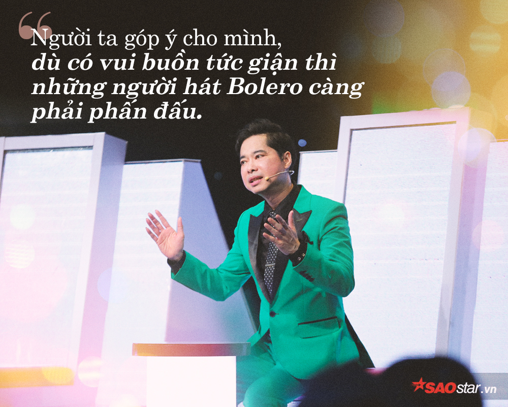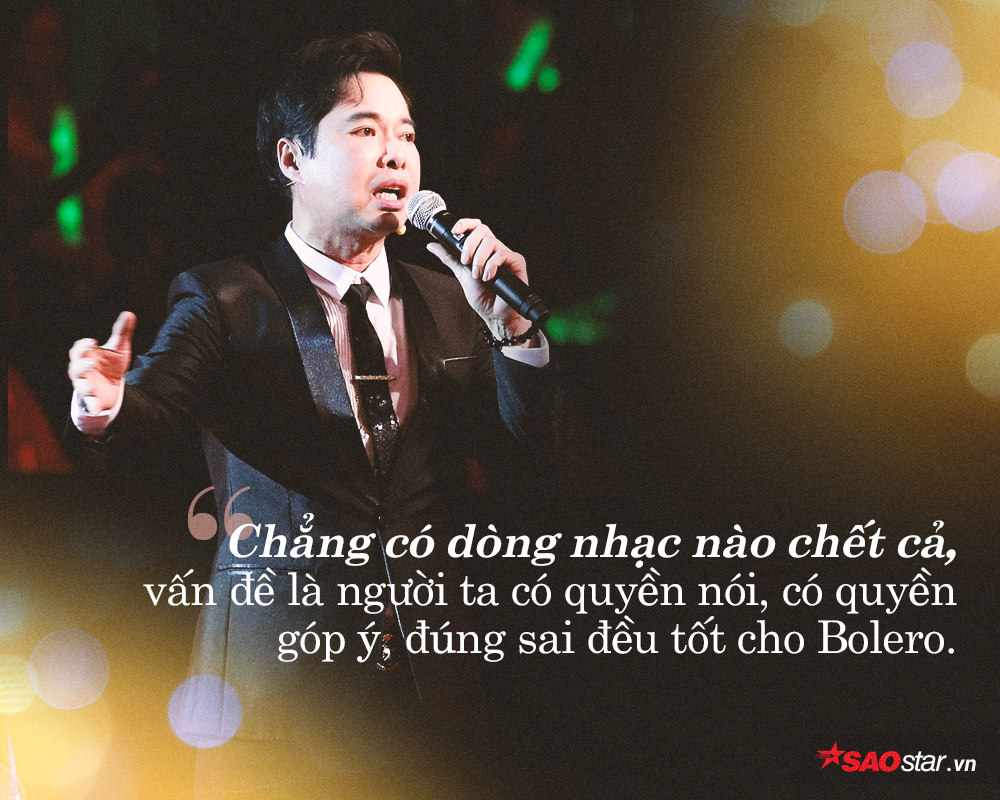 - Mỗi góp ý đều có cái hay. Trong một cơ thể con người, ví dụ như võ sĩ va chạm thì gãy cơ, gãy tay, chân… nhưng tâm hồn thì vẫn vậy. Người ta góp ý cho mình, dù có vui buồn tức giận thì những người hát Bolero càng phải phấn đấu, những góp ý, ý kiến trái chiều hoặc thuận chiều đều tốt cho Bolero hết vì người ta nghe sao ủy mị quá, rên rỉ quá thì phải chỉnh sửa.