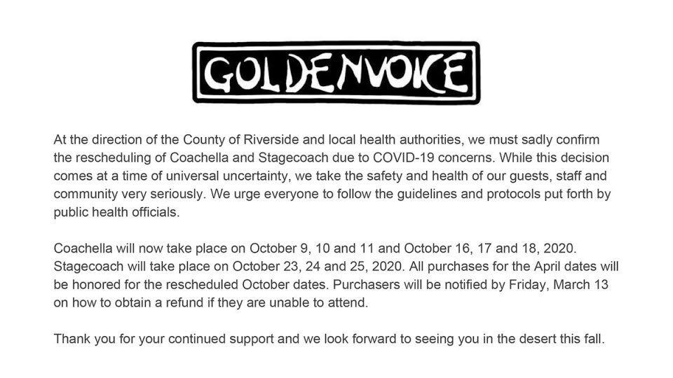 Đầu tuần này, Coachella Valley Music & Arts Festival (Liên hoan Âm nhạc & Nghệ thuật Thung lũng Coachella) đã tranh luận về việc có nên hủy bỏ hay tạm hoãn lễ hội tháng 4 do sự bùng phát của đại dịch corona tại Hoa Kỳ. Sau thời gian bàn bạc, BTC đã đưa ra quyết định tạm hoãn sự kiện này đến tháng 10/2020.