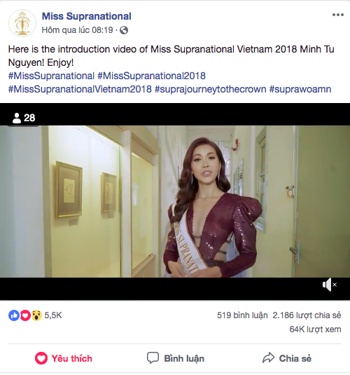 Cách đây vài ngày, Minh Tú - đại diện Việt Nam tại Miss Supranational - Hoa hậu Siêu Quốc gia 2018 đã đăng tải đoạn clip giới thiệu bản thân đến cuộc thi này. Đoạn video nhanh chóng nhận được sự chú ý từ các fan sắc đẹp không chỉ của Việt Nam mà còn ở các nước trên thế giới theo dõi cuộc thi. Điều thành công và ấn tượng của Minh Tú qua đoạn clip này đó chính là giới thiệu một cách chân thực và tự nhiên về bản thân mình, không giả tạo, gò bó, hay theo bất kì khuôn mẫu cứng nhắc nào.