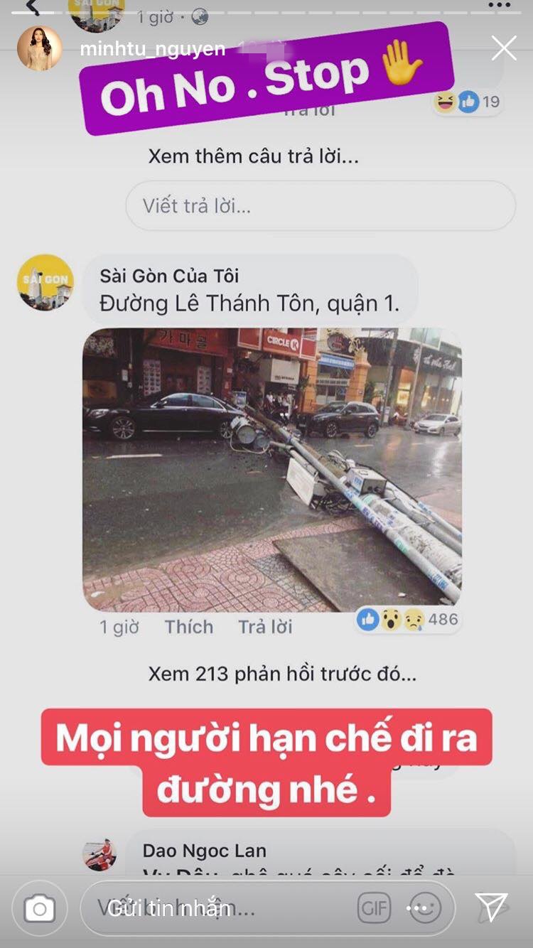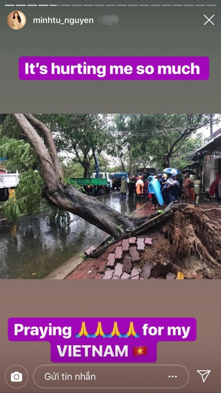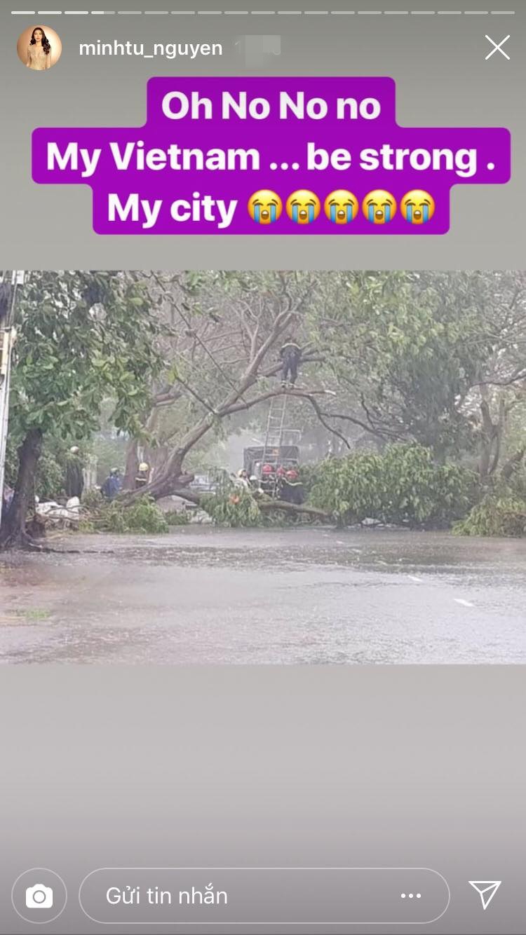 Dù đang chạy nước rút trong cuộc thi Miss Supranational 2018 tại Ba Lan, tuy vậy, Minh Tú cũng không thôi hướng về quê nhà nơi đang xảy ra cơn bão lớn gây ảnh hưởng nghiêm trọng đến người dân. Trên trang cá nhân, người đẹp vô cùng lo lắng, xót xa cho tình cảnh dân chúng và khuyên mọi người hạn ra đường trong tình hình thời tiết khắc nghiệt này.