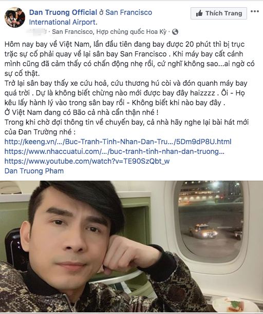 Sau một thời gian đi lưu diễn ở Mỹ, hôm qua, ca sĩ Đan Trường đã quyết định về Việt Nam. Tuy nhiên, máy bay mà nam ca sĩ ngồi lại gặp sự cố. Đan Trường chia sẻ trên trang cá nhân: “Hôm nay bay về Việt Nam, lần đầu tiên đang bay được 20 phút thì bị trục trặc sự cố phải quay về lại sân bay San Francisco. Khi máy bay cất cánh mình cũng đã cảm thấy có chấn động nhẹ rồi, cứ nghĩ không sao…ai ngờ có sự cố thật.
