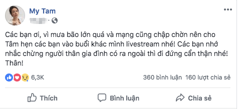 Mỹ Tâm chia sẻ trên trang cá nhân những dòng trạng thái thông báo về tình hình thời tiết trong mùa mưa bão, đồng thời nhắc nhở mọi người nên cẩn thận với thời tiết. Cụ thể, nữ ca sĩ viết: “Các bạn ơi, vì mưa bão lớn quá và mạng cũng chập chờn nên cho Tâm hẹn các bạn vào buổi khác mình livestream nhé! Các bạn nhớ nhắc chừng người thân gia đình có ra ngoài thì đi đứng cẩn thận nhé!